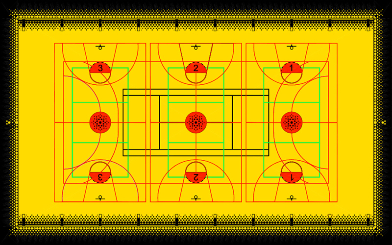 La mission pour la couverture d’une aire de sport nous a été confiée en avril 2000 par la Région Ile-de-France. Le budget d’origine de l’opération était de 2.4 MF HT soit 366 000 € HT. Il a été complété en cours d’étude afin de mettre en conformité avec la réglementation, les dispositions d’accès de l’aire de sports aux handicapés. Le coût des travaux s’élève à : 456 000 € HT. Un premier Permis fut déposé fin 2000 puis un second en 2003 (le premier étant devenu caduc). Le chantier a démarré en février 2005 et livré en Novembre 2005. A l’origine existait une aire d’évolution sportive réalisée dans le cadre des travaux pour le nouveau lycée de La Tourelle à Sarcelles au début des années 90. Une étude pour sa couverture nous a été confiée en 2000. Il s’agissait de pouvoir faire du sport 4 saisons ce qui est bien le moins que l’on puisse exiger pour un nouveau lycée de cette importance. Plus qu’un parapluie, il s’agissait pour nous de repenser le statut d’une aire de sport dans un environnement scolaire, de sortir la pratique du sport de son académisme. Dans la réalité nous étions en présence d’une surface rectangulaire, revêtu d’un enrobé, avec toute une série de marquages déclinés de disciplines sportives sans qu’aucune ne respecte les dimensions réglementaires. Les contingences en termes de surface ne nous ont pas permis de mettre en œuvre des surfaces d’évolutions réglementaires. Dés lors le projet consisté à mettre en œuvre une aire d’initiation et d’entraînement. Le plaisir d’apprendre et de se perfectionner nous ont conduit à reformuler l’image du sport dans un lycée, à Sarcelles, en tentant de réduire le décalage entre les aspirations des utilisateurs, leurs tenus et leurs pratiques sportives et un environnement technicien et académique qui prévaut. L’utilisation de charpente en lamellé collé, (élément de structure le plus économique pour ce type d’équipement) nous donné la teinte de base. Il s’agissait maintenant de dissoudre la présence de la structure dans un tube, dans un environnement choisi prenant ses distances avec les contingences techniques. Nous avons donc cherché le matériau translucide qui permettait d’avoir une lumière douce et réparti et dont la tonalité se rapproche le plus possible de celle de la charpente. Puis cette exigence fut déclinée pour la tonalité du sol, les éclairages au sodium etc. Le tube doré, univers courbe, chaud, est géométrisé par un graphisme au sol fait de déclinaison de tracés et de signes issus du monde du sport.