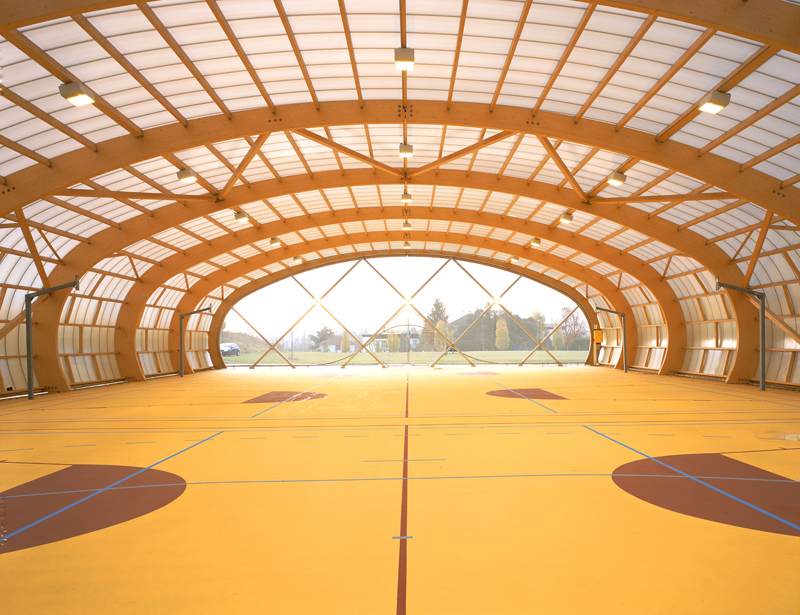 Located 16 kilometers from Paris, Sarcelles is part of the “banlieue” that hurriedly accommodated the immigrants who arrived at the end of the 50s. With a current population close to 60,000, Sarcelles consist of a small old core and a huge expansion to the south known as Le grand Ensemble and conceived in 1965 by Jacques Henri-Labourdette. Paradigm of an urban plan where the urgency of social housing was such that no thought was given to mitigating the conflicts of coexistence, fifty years after it went up the city is the scene of confrontations between communities of different belief and has an unemployment rate nearing 20%. Sarcellite, the name of the disease that afficts French neighborhoods built in the late 50s, is name after this municipality that now is the object of an ambitious urban renewal operation. Such is the context behind the project of creating cover and access for disabled people in a multi-sport court of the secondary school of la Tourelle. For the architects, more than building a roof, the idea is to extract the practice of sport from a school context, where the dimensions imposed by regulations were not possible, for which reason there could only be a beginners’ court. The choice of materials is a kind of metaphor on the desire to reduce the difference between the aspirations of the users and their sport activities on one hand, and the dominant technical and academic environment on the other. The structure of laminated wood is diffused within a tube covered with a translucent material that distributes the light homogeneously and does not create strong contrasts with the wood. Add to this, the graphics of the ground and a double grille at the ends, tensed in accordance with models of curves and counter-curves that turn them into two enormous pairs of glasses. The collaborative work with the client (Malik MOUHOUD, project manager of the Region Ile de France) has led us to reformulate the image of sport in a school, in Sarcelles, trying to narrow the gap between the aspirations of the users and the academicism which generally characterizes this type of program.