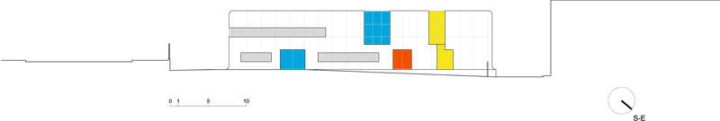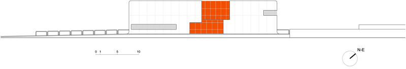 We reduced the site to a bus park, a vast monolithic concrete slab, uniformed territory composed of one sole material. The building starts with the deformation of the ground, the distortion of the existing concrete slab, and continues it with an apparently similar material Ductal ®, still concrete but a dazzling sheet of concrete, which responds to very sophisticated demands: informality of the structure, constant evolution of the plans, dematerialization, precision, density, homogeneity of aspect according to the mould designed. It ensures a continuity of the ground from the road, to the skin of the façades, the suspended ceilings and the terrace rooftop without any rupture. This possible dematerialisation comforts the approach of sustainable construction objectives; the precision contributes to the conception of the facades as a skin with an exterior isolation, homogeneity of aspect allowing carrying out any specific pattern. Combined with the structural qualities of the material, the building has neither a beginning nor an end. It is a continuity of a surface of which we can, depending on what you aim at, not control the limits. It is an inflection of a slab which spreads on the whole site.