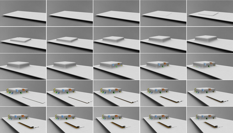Nous avons réduit le site à un parking de bus, une dalle de béton vaste et monolithique, territoire uniforme composé d’un seul matériau. Le bâtiment débute avec la déformation du sol, distorsion de la dalle de béton existante, et continue avec un matériau d’apparence similaire, le Ductal ®, toujours béton mais fibré, sans armatures, dont les ultra-hautes performances permettent de réaliser une feuille de béton d’une extrême finesse, qui répond à des exigences spécifiques, sophistiquées : informalité de la structure, évolution constante des plans, dématérialisation, précision, densité, homogénéité d’aspect. Il garantit une continuité depuis la voirie, se développe sur les trottoirs, se retourne sur les façades, les plafonds suspendus et les terrasses sans aucune rupture. La précision du matériau combinée avec ses qualités structurelles fait que le bâtiment n’a ni début ni fin. C’est une surface continue dont nous n’avons pas à contrôler les limites. Le bâtiment est déformation par emboutissage de son contexte – homogénéité entre le bâtiment et son support au point de les confondre. Cette croute qui recouvre la zone de roulage des bus est ainsi déformée, modelée pour venir gainer tel un morphing le programme composite du centre administratif. Il en résulte un monolithe aux arêtes arrondies, apparemment polies, de plan carré : 35 m x 35 m développé sur 2 niveaux, un bâtiment dense, inerte, sourd, énigmatique comme la coque d’un sous-marin russe affleurant dans les eaux de Mourmansk.