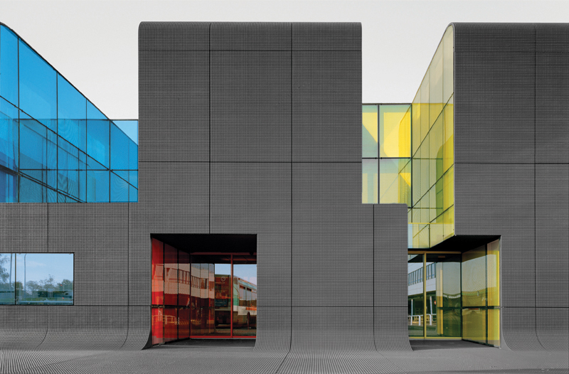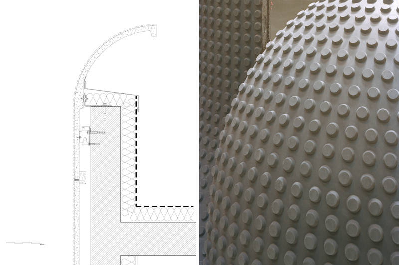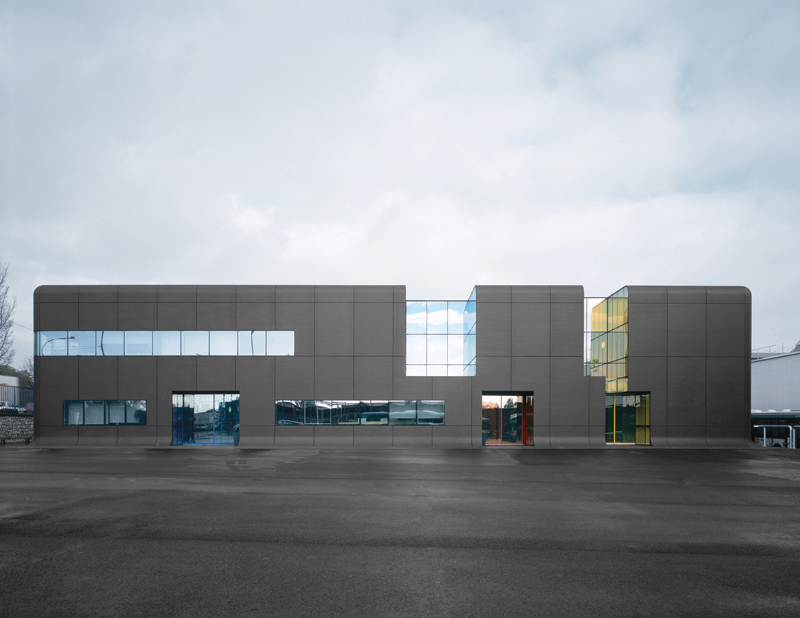 The building appears like a monolith with rounded edges, polished somehow. Characterized by a dense square plan (35m x 35m) developed on 2 levels, it presents itself as the continuity of the banal coating of the roads, like a piece stamped from distorting the existing concrete surface of the Bus Center. The Ductal ® is used here as a morphing to cover the carcass of a composite program. The result is a dense building, inert, deaf, and enigmatic as “the hull of a Russian submarine in the waters of Murmansk”. The building is deformed by stamping its context – uniformity between the building and its support to a point of confusion. This crust that covers the evolution area of the buses is distorted, modeled to cover the administrative center. The “windows” are cut with a cutter blade : surgical incisions generating volumes in negative which reveal colored mirrors under the thin crust of concrete. The texture games are facilitated by the flexibility of the material and its ability to be molded with precision. The quality of finish and rigor of Ductal ® contribute to ensuring this concrete skin, accurate, continuous, perfect connections. The skin : 3 cm thick displays a single texture of dots in relief like a game of « LEGO »: 24 mm diameter x 7 mm high, distant of 12 mm. The concrete hull is cut out with a cutter putting at sharp, revealing cavities of reflective and coloured glass under the concrete crust. Treated with silver mirror dots, chromatics of the glass products are inspired by the tinted curtain wall frontages of the office buildings which border the main road.