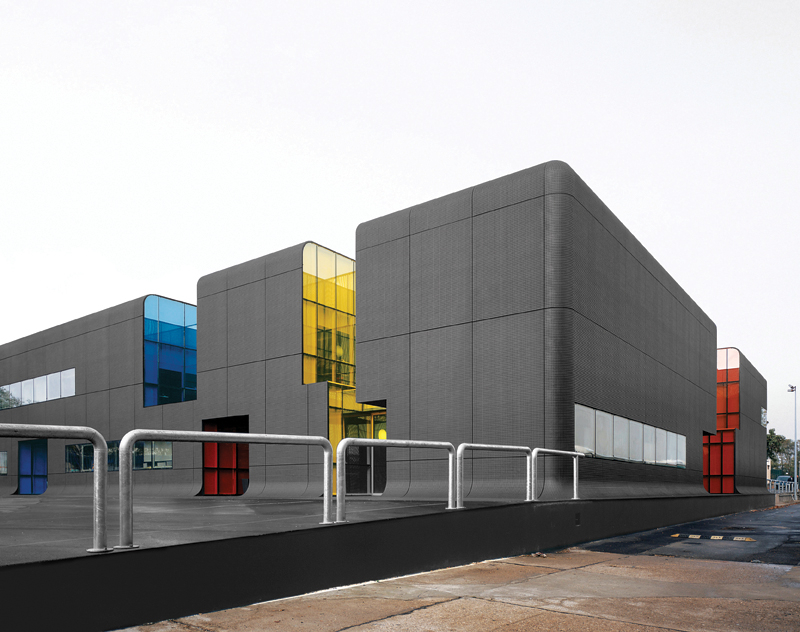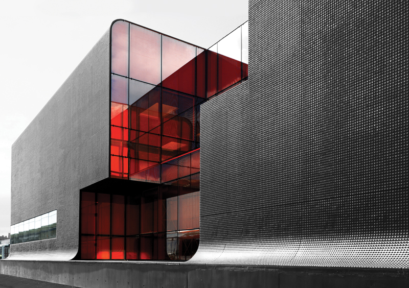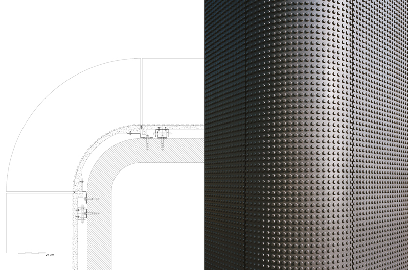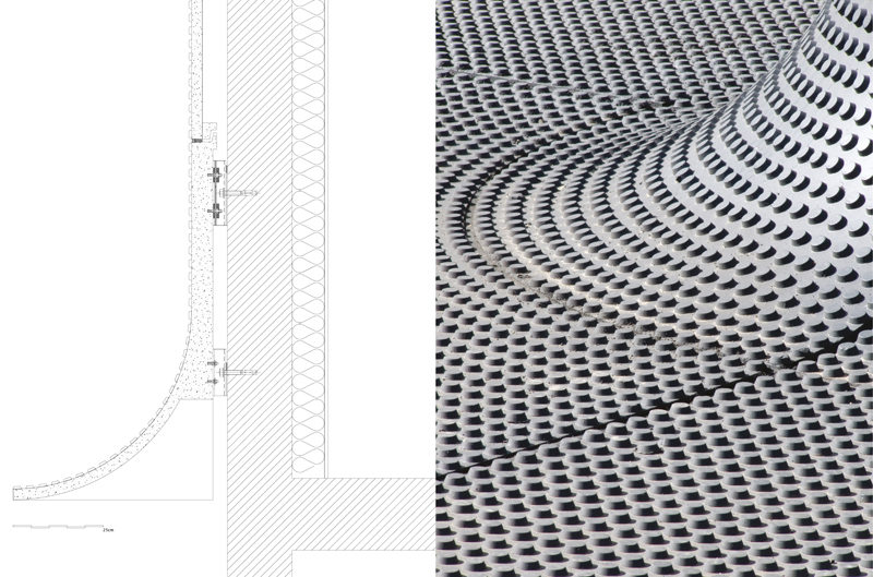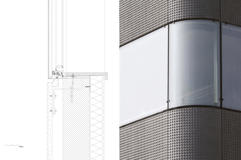 Les jeux de texture sont facilités par la souplesse du matériau et son aptitude à être moulé avec précision. Ainsi, les qualités de fini et de rigueur du Ductal® contribuent à garantir à la vêture des retournements précis, continus, parfaitement calepinés et raccordés. Cet épiderme de 3 cm d’épaisseur affiche une seule et même texture de picots en relief à la façon d’un jeu de « LEGO « décliné suivant un pas de 12 mm. Les percements sont découpés à la lame, incisions chirurgicales générant des volumes en négatif laissant apparaître des jeux de miroirs colorés sous la fine croute de béton. Traitée avec une trame de points miroir, la chromatiques des vitrages est inspirée par les façades-rideau réfléchissantes des bâtiments de bureau qui bordent la voie principale.