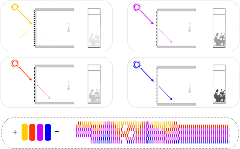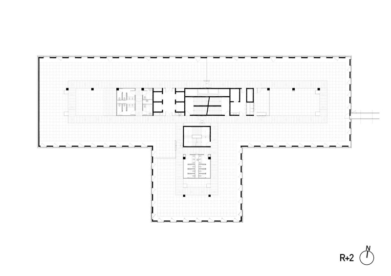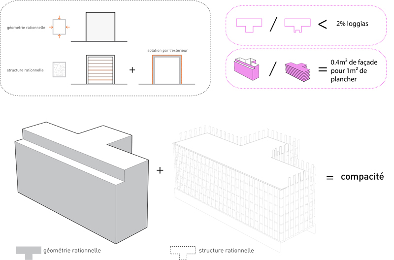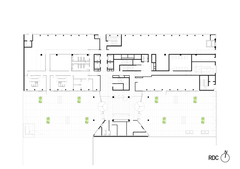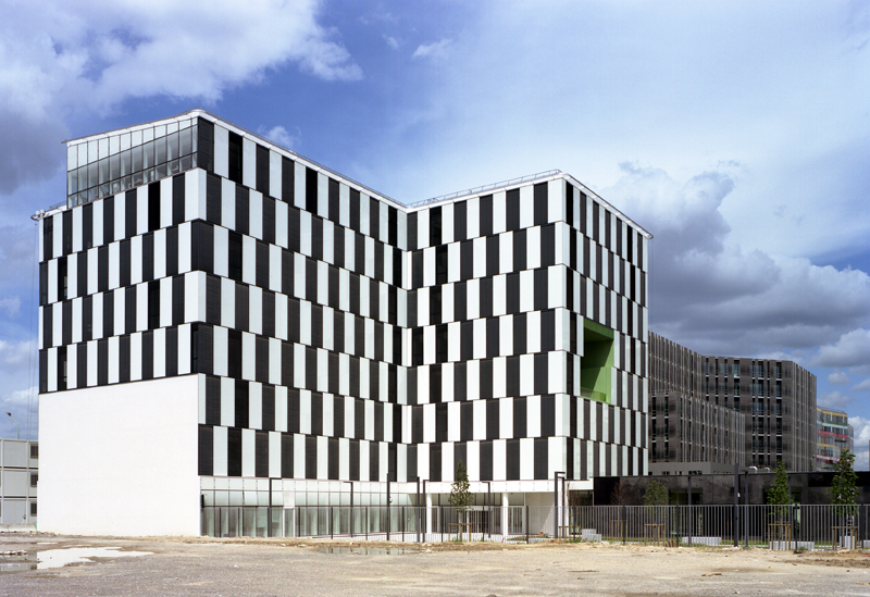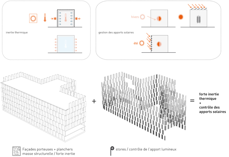 Nous avons cherché, dans les limites des contraintes d’un programme tertiaire ambitieux, à générer un bâtiment à forte compacité présentant un rapport entre surface d’enveloppe et surface de plancher le plus performant possible.La nature même de cette enveloppe conforte cette stratégie énergétique. Il s’agit d’une façade porteuse, isolée par l’extérieur et habillée d’une peau de verre ventilée naturellement. Ce type d’enveloppe épaisse confère au bâtiment une excellente inertie thermique en limitant les échanges de température entre l’intérieur et l’extérieur tout en lissant les cycles thermiques. L’enveloppe exprime par son écriture architecturale le rapport critique [ plein/vide = environ 50%] par l’alternance systématique d’un module de façade opaque avec un module transparent de dimensions sensiblement identiques.