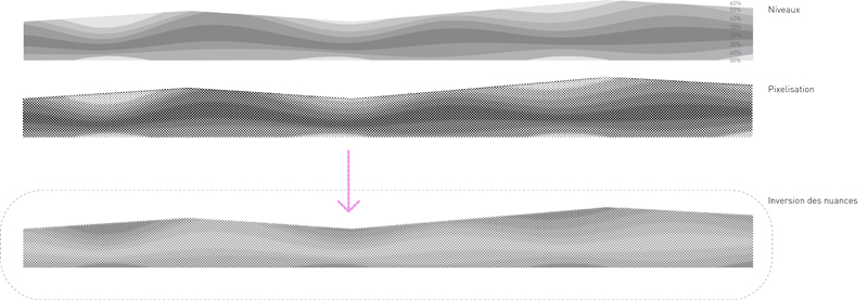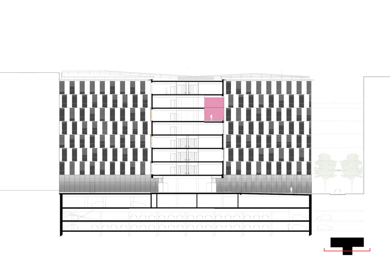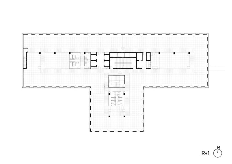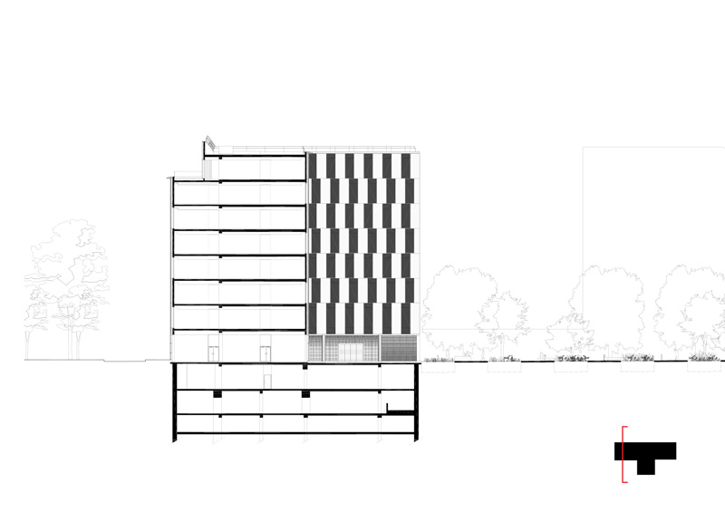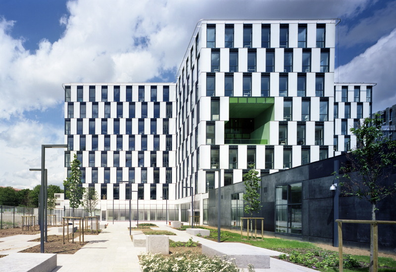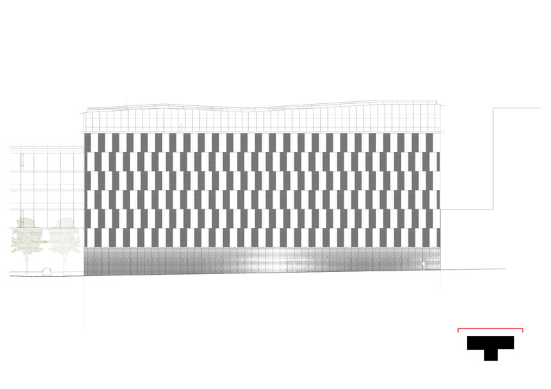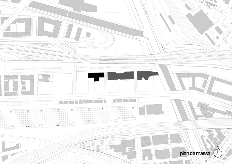 De même, particulièrement au sud, le choix d’une protection solaire adaptée, d’après une analyse fine des apports solaires, affirme la prise en compte des enjeux énergétique et notamment ceux dus aux surchauffes par rayonnement solaire. Dans une volonté d’intégration dans le programme global de la ZAC Claude Bernard, la conception du rez-de-chaussée prend soin de ménager une large transparence depuis le boulevard McDonald vers « la forêt linéaire ». Un traitement architectural par sérigraphie spécifique du verre permettra de masquer les contingences techniques liées au fonctionnement du bâtiment. Le niveau d’attique a fait également l’objet d’une attention particulière dans sa volumétrie dans le but de créer un signal, une identité visuelle pour la ZAC Claude Bernard depuis le périphérique.