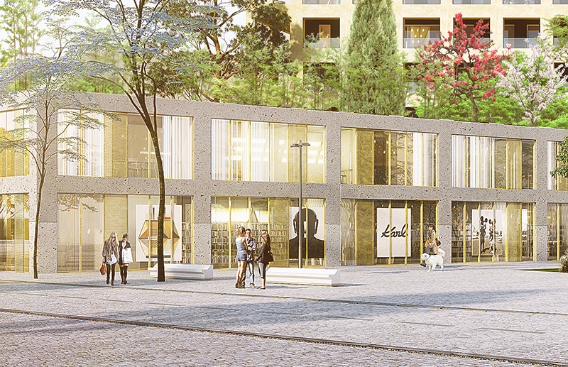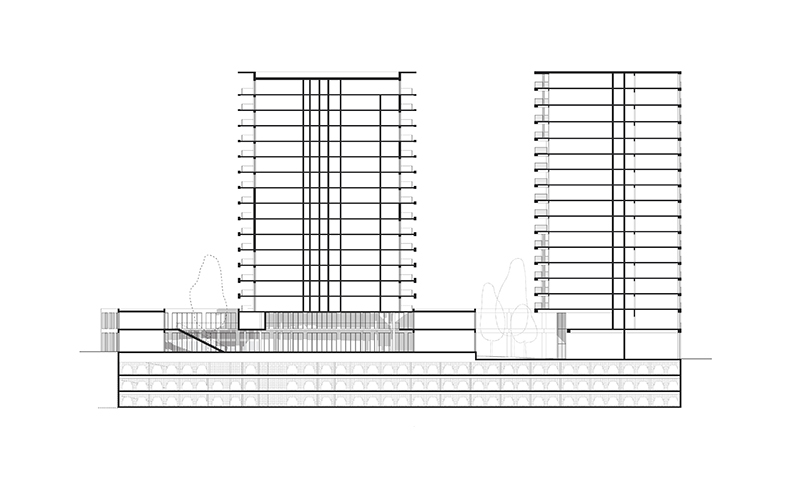 Ainsi Soho, jardin et commerce, sertissent-ils hall et espaces de services liés aux résidents. Le déploiement d’une trame perforée qui accueille les différents programmes constitue les fondations, permettant le déploiement de deux verticalités. Nous partageons en commun ce rapport à l’espace public, nous mutualisons l’horizontalité, ces premiers mètres perçus par le promeneur depuis le trottoir. Cette propriété est ici encore renforcée par le fait que seuls 2 angles ténus viennent à l’alignement passé de deux niveaux sur tout le déploiement ouest de la parcelle. Il s’agit d’une figure en L, un socle qui se relève à la verticale pour s’appuyer sur l’est, donner de la masse à opposer au levant.