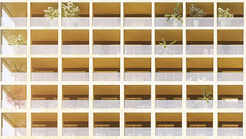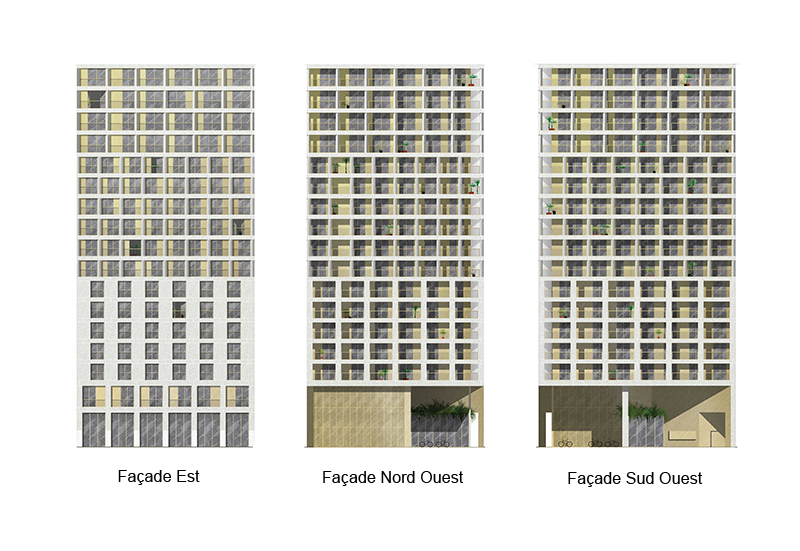 Au-dessus, il s’agit d’être compact et léger, dense et élancé, rationnel et composite. Notre projet s’est construit avec la volonté d’échapper aux fatalités formelles liées à la verticalité pour développer cette notion de paysage élargi, quand on pourra voir loin et être vu de loin. La façade est donc ici un filtre entre extérieur et intérieur, un espace ayant valeur d’usages compris entre la ville et l’intime – être chez soi en ville.