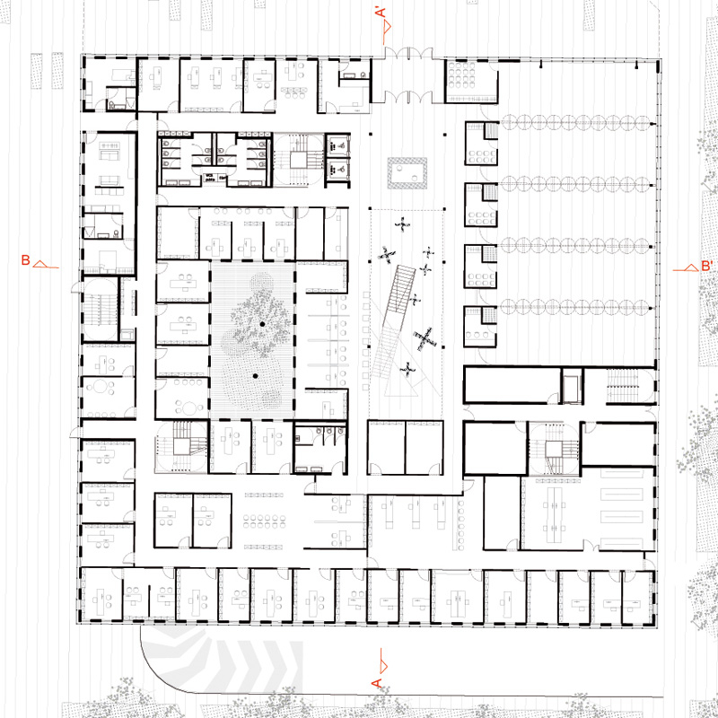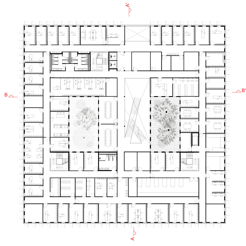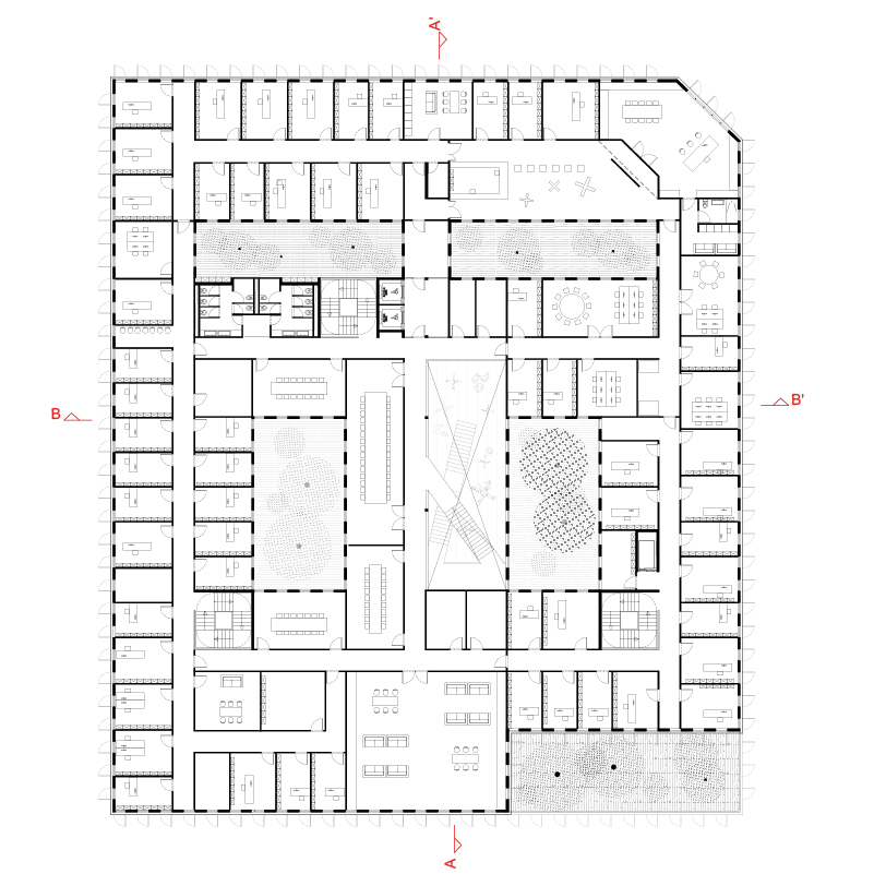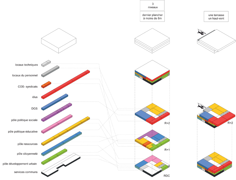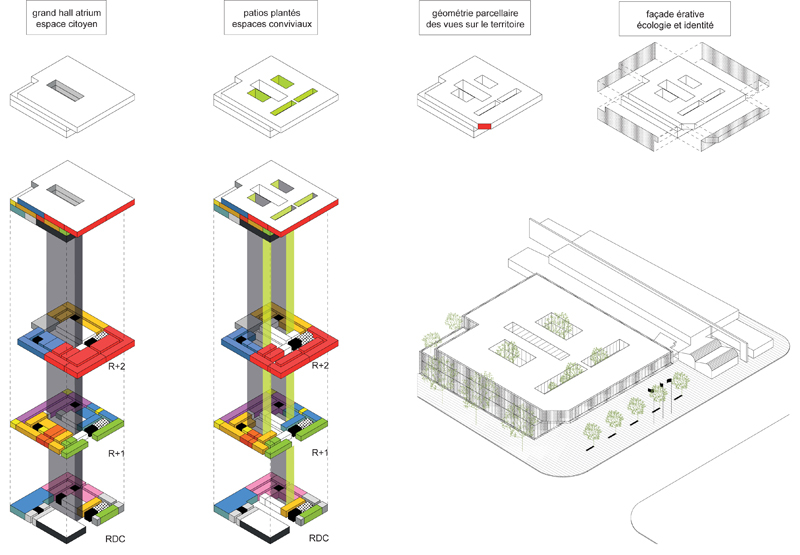 Le volume de la Mairie se décompose en trois niveaux dont les deux premiers sont destinés à accueillir les services aux publics tandis que le dernier niveau accueille les élus, le maire et ses adjoints. Le dernier niveau glisse et permet de créer côté Sud une terrasse associée à l’espace détente du personnel et côté Nord un porte-à-faux au dessus du parvis marquant et protégeant l’entrée de l’hôtel de ville. La conception d’un bâtiment développé sur trois niveaux nous permet de rester à moins de 8 m au dernier plancher accessible et de gérer l’ensemble de l’Hôtel de Ville comme un seul et même volume. Cette unité spatiale permet une bien meilleure fluidité entre les niveaux avec des escaliers ouverts, des percées et continuités visuelles, un meilleur fonctionnement en limitant les sas et les portes coupe-feux, ainsi qu’une meilleure accessibilité en terme de maintenance et d’exploitation. Pensé comme véritable incubateur de la ville, l’hôtel de ville organise ces trois niveaux autour d’un grand hall atrium ainsi que deux grands patios plantés. Largement ouvert et pensé comme continuité du parvis, l’atrium constitue un espace d’entrée de près de 300 m². C’est un lieu ouvert, accueillant, un espace citoyen où circulent et s’échangent les informations et les services de la commune de Bonneuil-sur-Marne. L’espace d’accueil se développe en longueur dans l’axe du bâtiment et sur toute sa hauteur. De la lumière naturelle pénètre par une longue verrière zénithale, et par une large baie vitrée délimitant un patio arboré. Le projet tire parti de la géométrie particulière de la parcelle pour créer au dernier niveau une large ouverture orientée vers l’avenue de Verdun. Cette géométrie, associée au bureau du maire ainsi qu’aux espaces de réunion et de réception dédiés offre un belvédère sur la ville ancienne de Bonneuil-sur-Marne et met en avant la relation entre le maire et ses habitants.