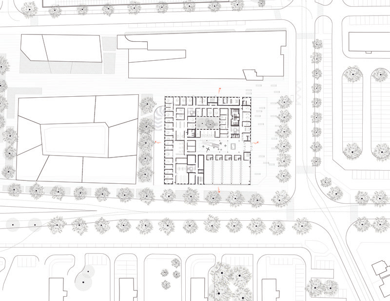 Le contexte dans lequel le nouvel hôtel de ville sera implanté est le point de départ de notre réflexion. Ici plus qu’ailleurs, l’hôtel de ville devra articuler, fédérer des paysages urbains d’une grande diversité, concourir à la mise en oeuvre d’une nouvelle polarité à haute valeur symbolique dans un environnement urbain hétérogène. L’intersection de deux voies majeures de Bonneuil-sur-Marne, entre l’avenue de Verdun et la route départementale 19 constitue un carrefour stratégique à la lisière d’urbanités fortes et confère à notre intervention un rôle d’interface entre les différents territoires de la ville. C’est un bâtiment fédérateur que nous vous proposons, un bâtiment qui articule la ville moderne et la ville ancienne, un bâtiment qui participe à la défi nition d’un paysage urbain, un bâtiment qui porte les valeurs d’une société ouverte sur son environnement. C’est donc autour de la définition d’un espace ouvert, un espace mettant en scène la ville, organisant des services et des programmes ouverts aux Bonneuillois, un lieu animé par ses acteurs et utilisateurs. Il s’agit d’un lieu vivant et attractif où le dynamisme de Bonneuil est donné à voir pour une administration proche et citoyenne.