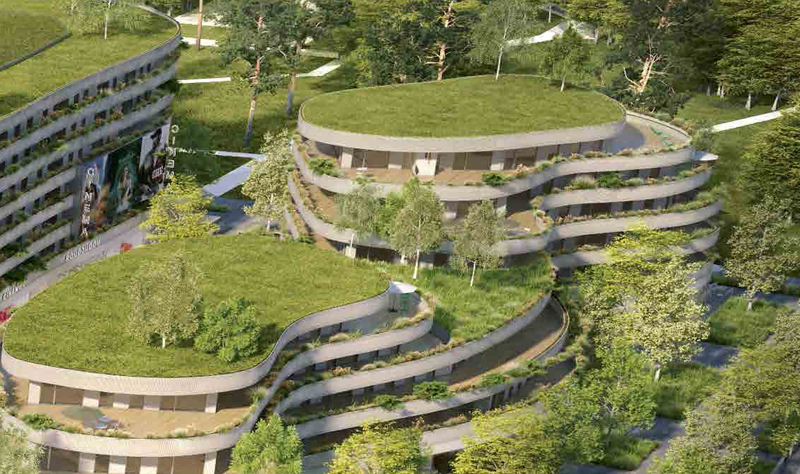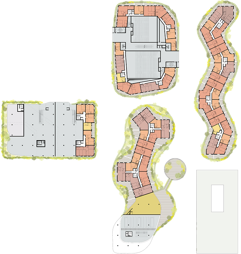 Ainsi nous proposons de partir d’un parallélépipède massif pour en déduire un morceau de paysage. Le quartier est pensé en une topographie qui mêle vides et pleins dans une gestion progressive de la hauteur. La masse est découpée, sculptée pour s’ouvrir à mesure que le bâtiment gagne en hauteur. De larges terrasses en rizières sont dégagées, en gradins successifs libérant de larges terrasses et balcons plantés, arborés. Ce travail d’élancement par allègement progressif dé-sature une centralité dense dans une gestion moins rectiligne de l’environnement. Nous sculptons trois émergences, chacune de hauteur différente selon leur vis-à-vis, celle au sud face aux maisons étant la plus basse, trois pièces d’un puzzle aux angles adoucis, trois collines support de plantations en paliers qui viennent en prolongement du parc.
