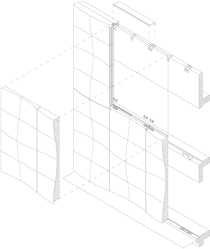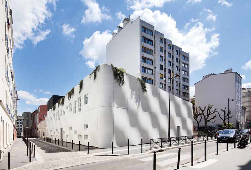 Des exigences et aspirations du programme, il résulte une façade monolithique et protectrice. Réalisée en béton de fibres à ultra-hautes performances, étanche, pérenne, elle se déroule tout en courbes et contre-courbes tel un ruban et enserre un jardin suspendu de pleine terre. Des ouvertures claires ou translucides positionnées à différentes hauteurs cadrent des vues sur la ville autant pour les tout-petits que les adultes parents ou « encadrants ».