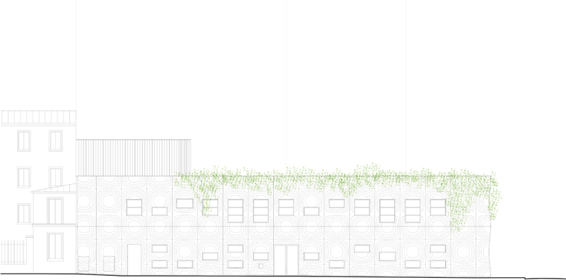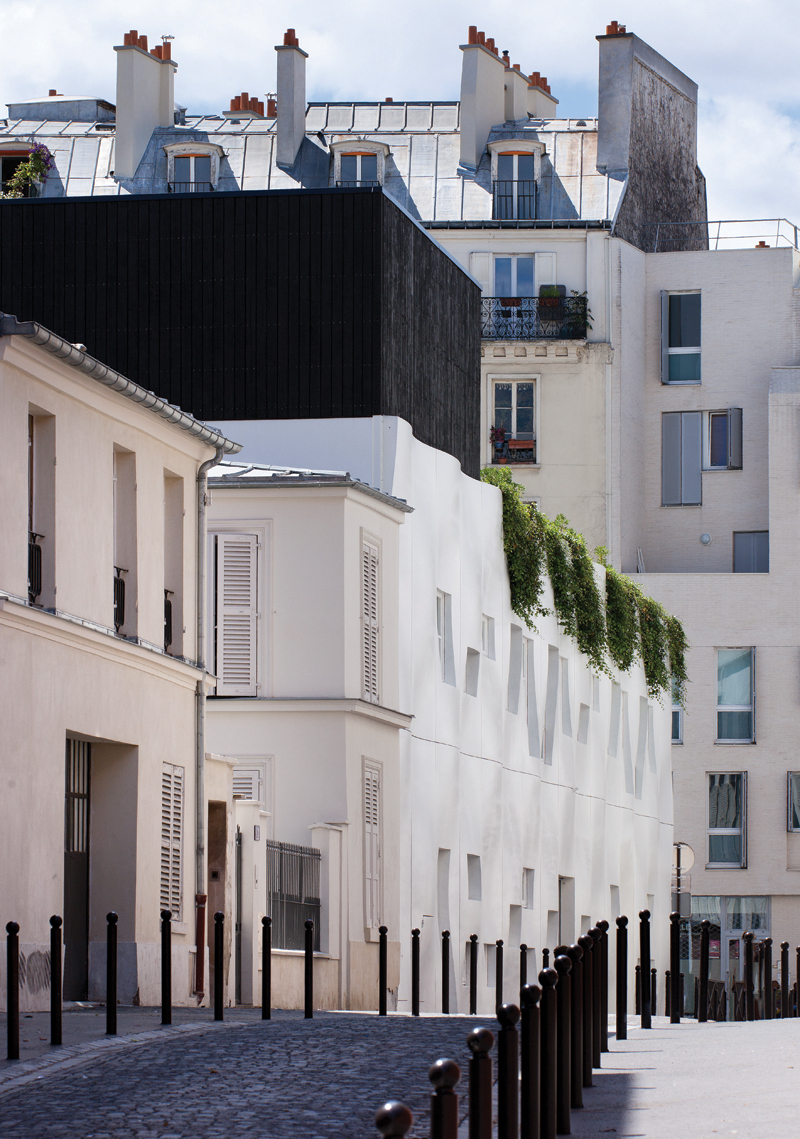 Le projet s’insère dans un quartier hétéroclite composé de bâtiments de tous gabarits, tous styles, toutes époques – un environnement, légèrement désuet, hybride et déstructuré, typique des faubourgs parisiens. La modernité est venue parachever ce désordre : une construction en retrait, hors alignement, hors gabarit – superposition d’une intention urbaine supplémentaire qui interdit tout dénominateur commun, tout retour en arrière vers une composition homogène –, jouxte le terrain. La crèche est donc une tentative, pour un tout petit bâtiment de service public, d’exister dans un rapport de masse défavorable à l’ombre d’une construction qui prend lumière et ensoleillement, surplombe et écrase.