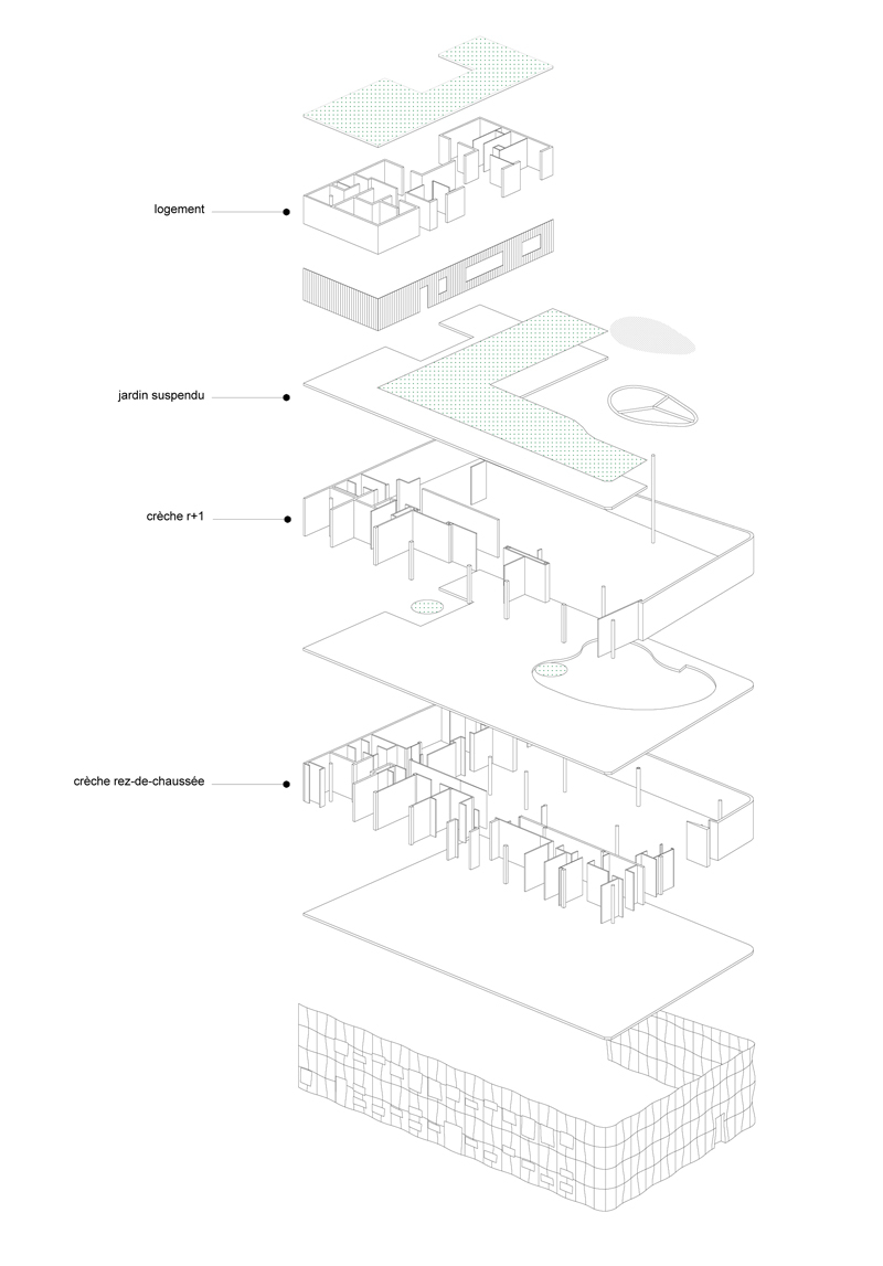Le programme de la crèche initie un petit gabarit, une petite échelle. Si la volumétrie est induite par les exigences du projet en termes de surfaces, d’échelle, l’écriture du bâtiment résulte de sa spécificité. La crèche est horizontale. Espace protecteur et introverti, elle occupe le sol, joue avec les espaces extérieurs. Développée sur deux niveaux, elle est organisée pour capter le maximum de lumière et d’ensoleillement, contourner l’effet de masque du grand gabarit voisin.