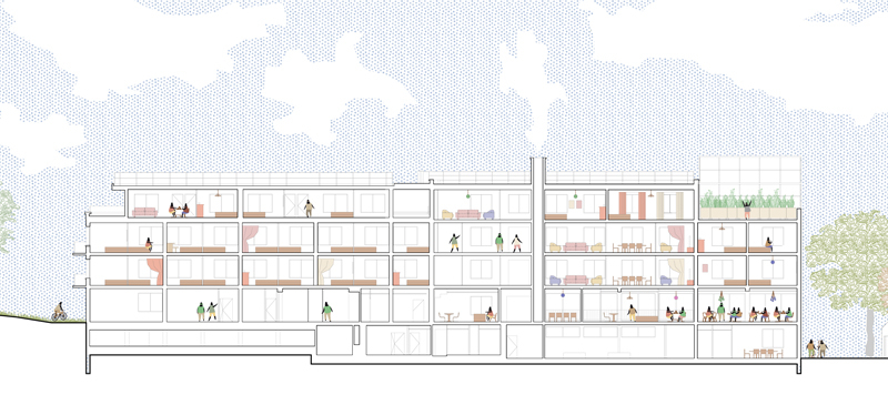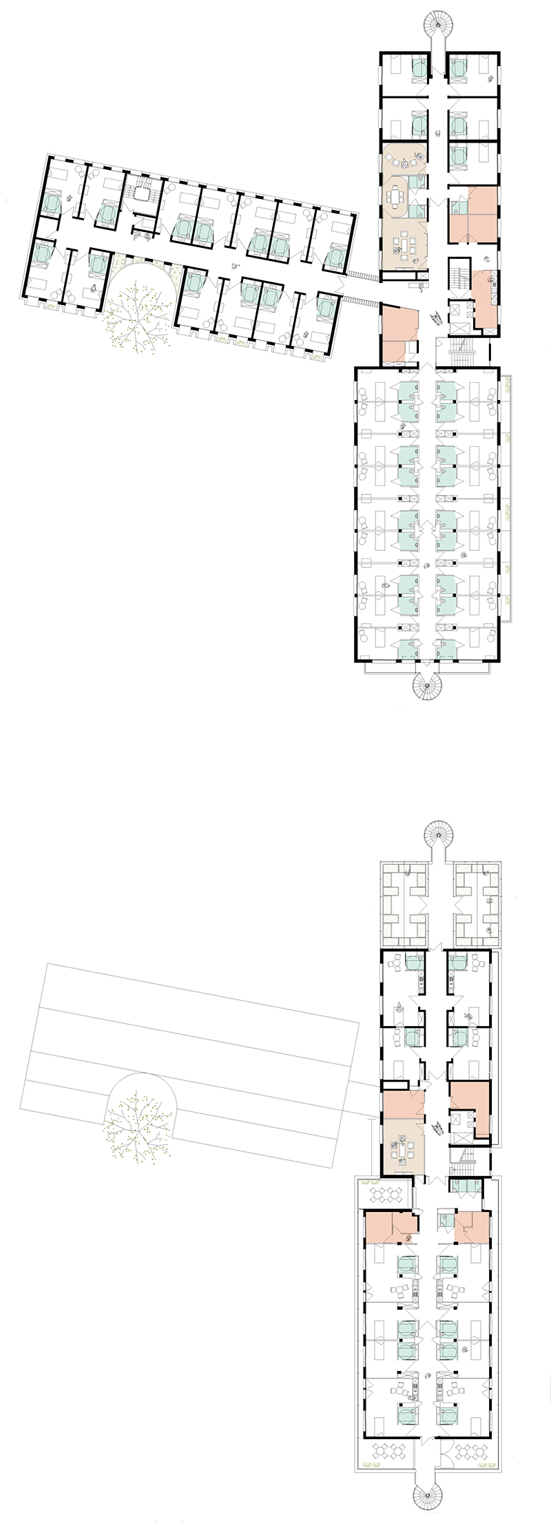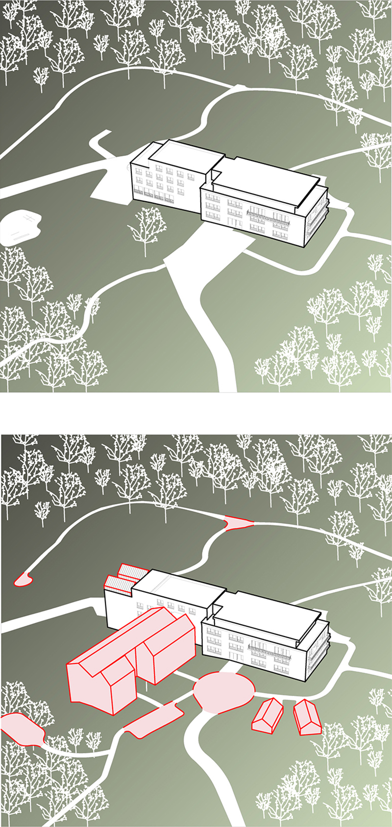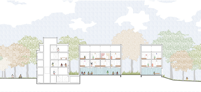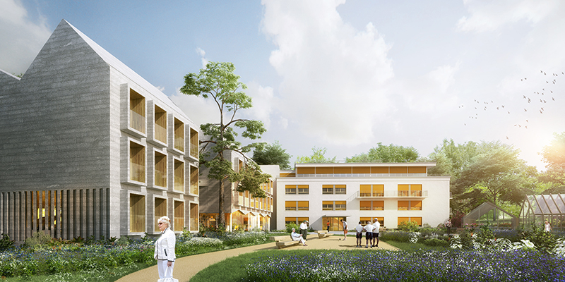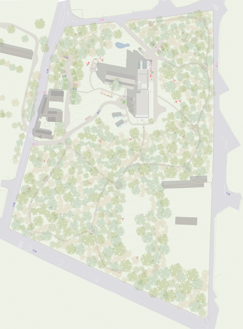 En rupture avec une image institutionnelle, nous proposons d’amorcer la figure du hameau, de démultiplier en de nombreuses échelles l’histoire du lieu, de proposer une identité qui fédère, propose harmonie, sagesse et optimisme. Nous reprenons l’archétype de la maison, de la demeure avec un jeu de toits. 2 bâtiments accolés prolongeant le corps de bâtiment existant, avec en vis-à-vis avec une grande serre, pour former une cour qui irradie et distribue le site.