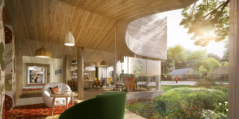 Ce hameau est organisé par deux places, une intérieure et une extérieure, articulées par un jardin d’hiver qui forme un sas, une transition douce et progressive.