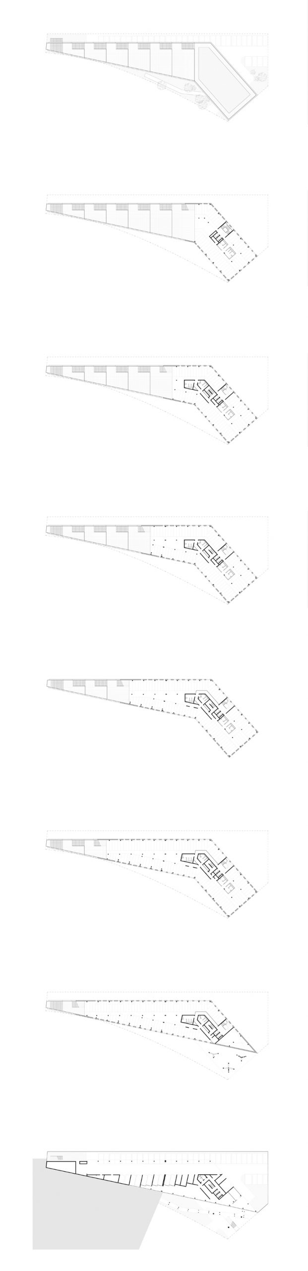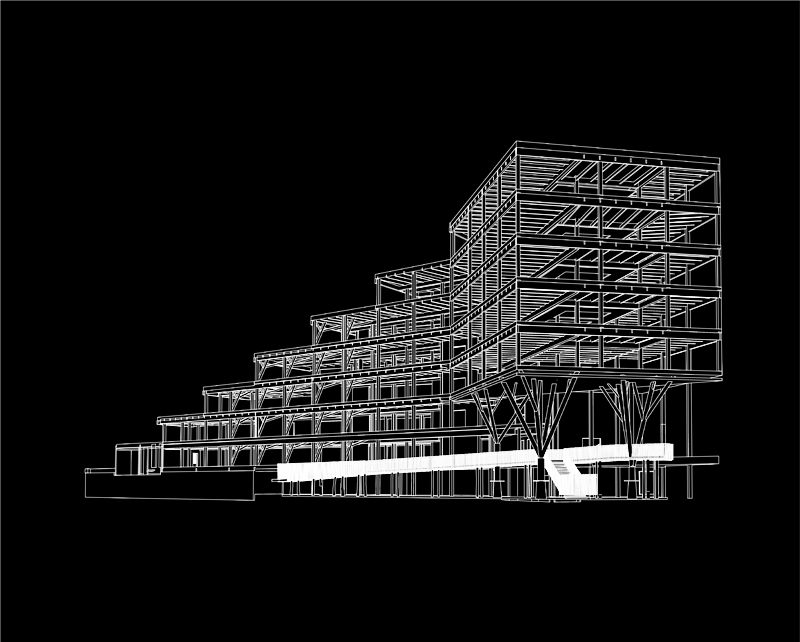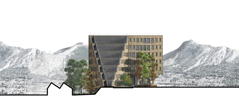 The facade-roof is envisioned as the unfolding of a landscape, an inclined plane that leads to a belvedere open to the wider landscape. A path goes from floor to floor from the city floor to the top of the building, offering a route that connects all the plateaus by a bucolic route. So I can access or leave my office by a path, a wide open-air staircase or a battery of elevators.
