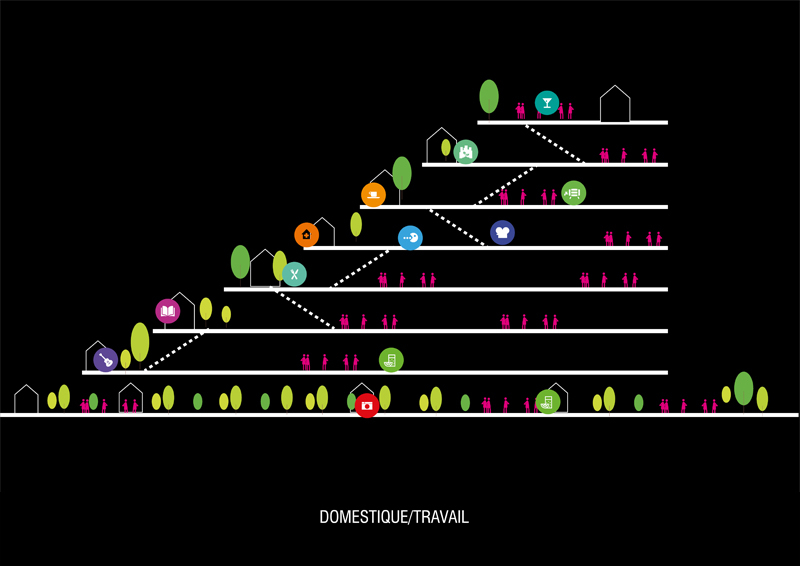 Here everything is done to promote gentle movements and allow a fluid connection between the different levels. The floors are connected by terraces, non-enclosed stairs or even elevators. It is about de-stratifying, promoting exchanges and meetings, promoting walking.