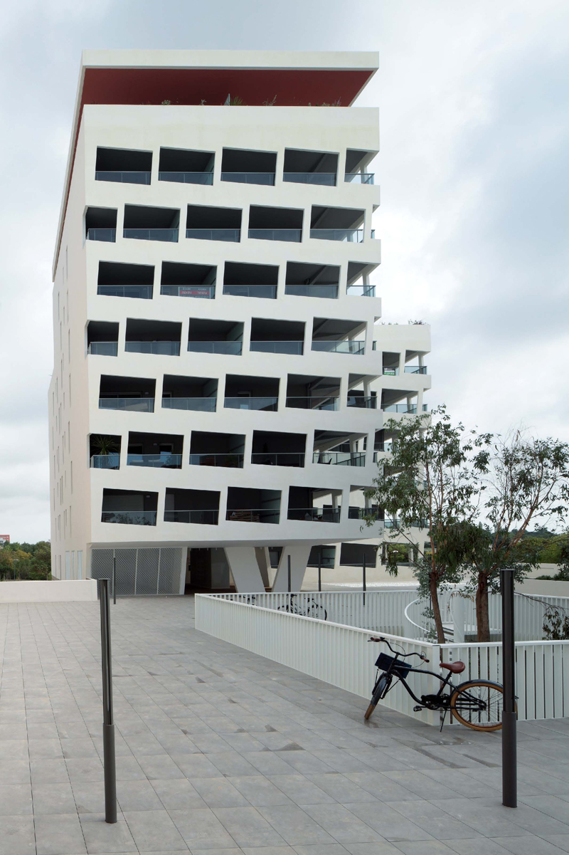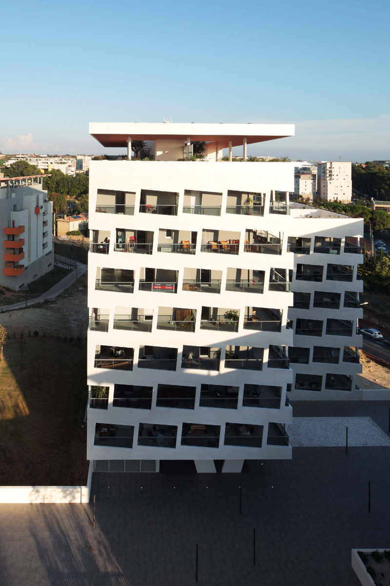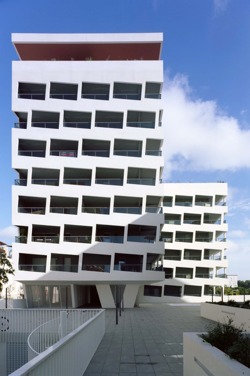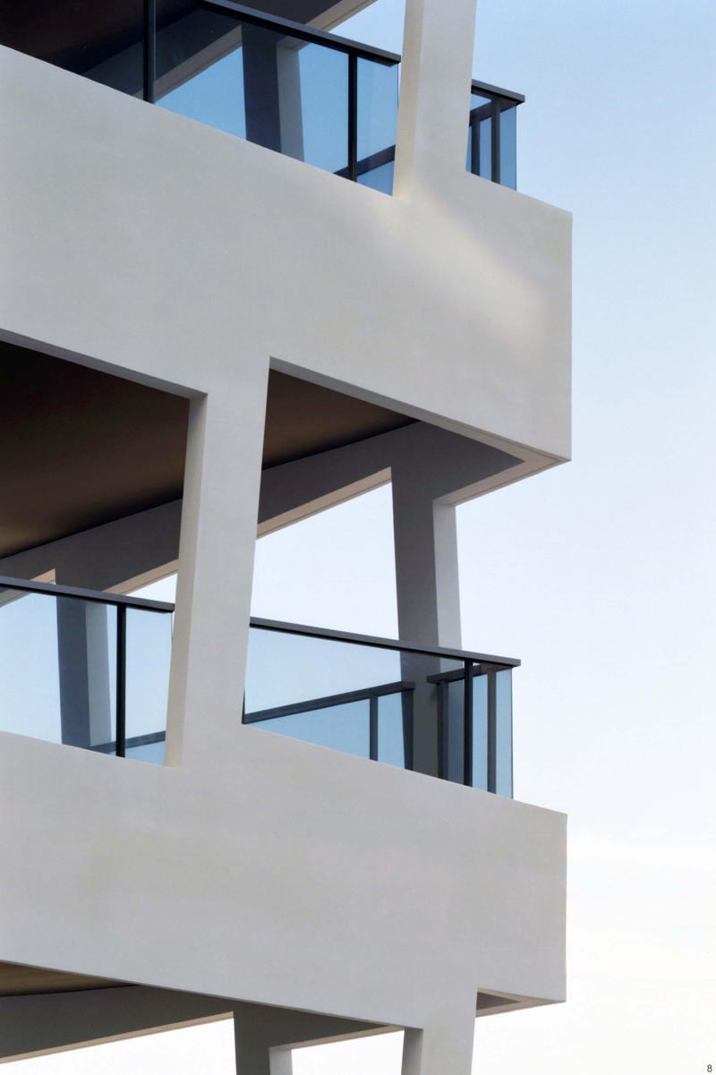 La peau extérieure des façades sud et ouest est en béton préfabriqué recouvert d’une lasure choisie dans un coloris blanc perle qui scintille sous l’effet des rayons lumineux. L’intérieur des loggias est en enduit gris foncé, contrastant avec la blancheur de la façade. Cet effet intensifie la perception du rythme et augmente l’impression de profondeur des loggias. Les façades nord et est sont recouvertes d’un enduit blanc mat dont la teinte, rejoignant celle des deux autres façades, accentue l’effet monolithique tandis que la dissimilitude des textures permet de jouer subtilement avec les contrastes. Les matériaux utilisés pour les balcons prolongent cet effet en associant des garde-corps en verre non teinté, légers et aériens, à des sous faces en béton vert teinté dans la masse.