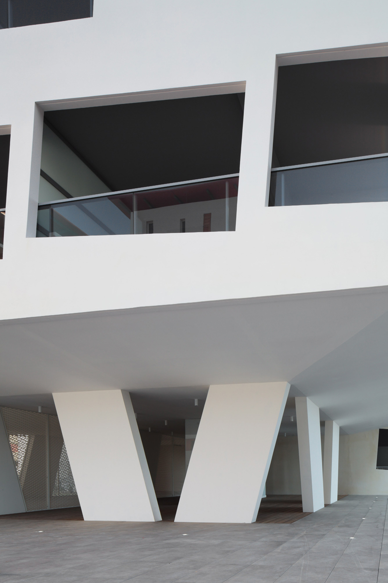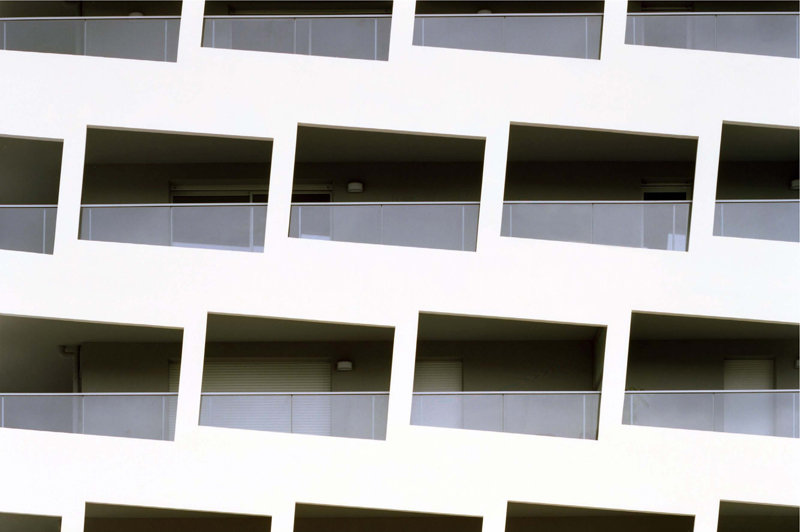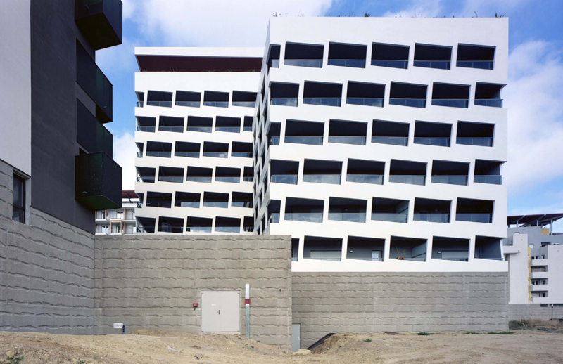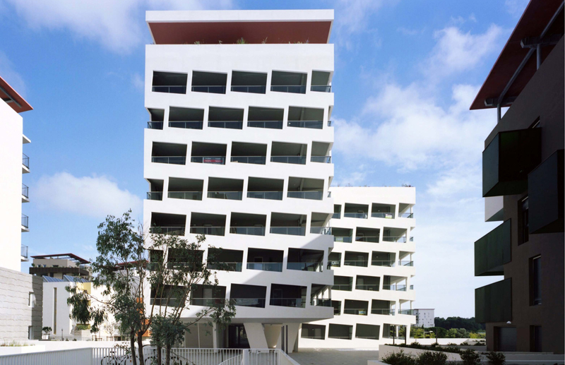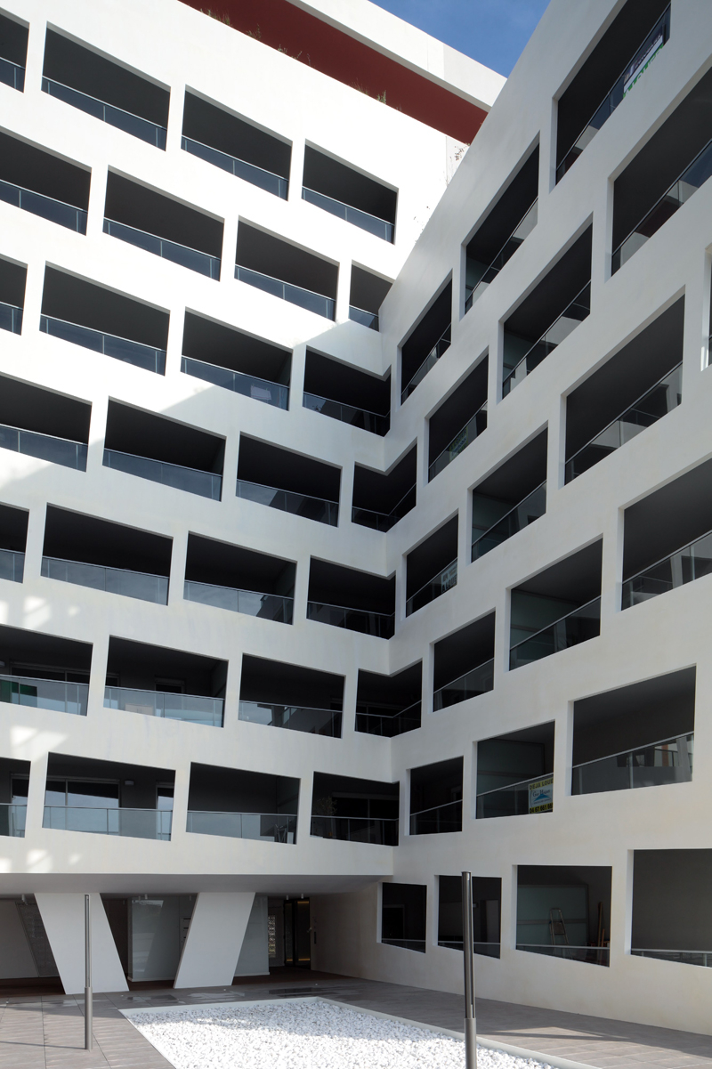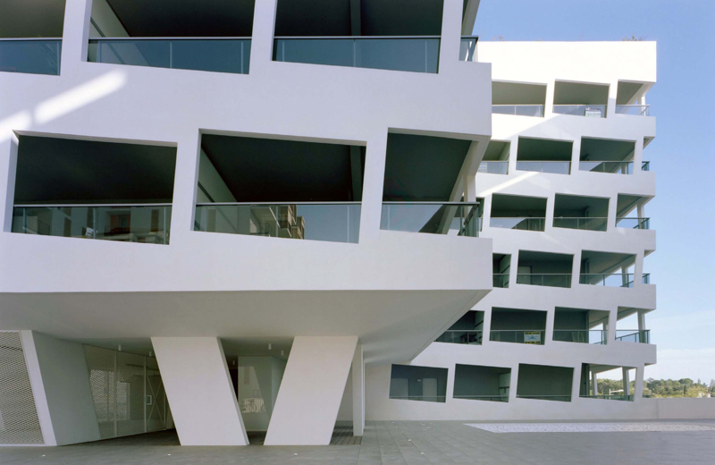 La peau extérieure des façades sud et ouest est en béton préfabriqué recouvert d’une lasure choisie dans un coloris blanc perle qui scintille sous l’effet des rayons lumineux. L’intérieur des loggias est en enduit gris foncé, contrastant avec la blancheur de la façade. Cet effet intensifie la perception du rythme et augmente l’impression de profondeur des loggias. Les façades nord et est sont recouvertes d’un enduit blanc mat dont la teinte, rejoignant celle des deux autres façades, accentue l’effet monolithique tandis que la dissimilitude des textures permet de jouer subtilement avec les contrastes. Les matériaux utilisés pour les balcons prolongent cet effet en associant des garde-corps en verre non teinté, légers et aériens, à des sous faces en béton vert teinté dans la masse.