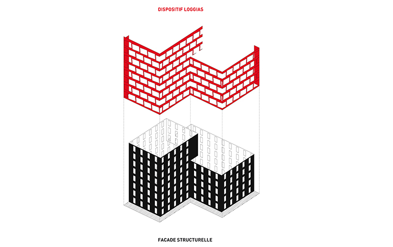 Sur les façades Ouest et Sud, on retrouve une double peau percée par les ouvertures des loggias. Ces dernières, placées de biais, rythment la trame globale du projet et apportent une respiration dans le massif du monolithe. La peau, distanciée de la façade « interne », propose une double limite entre espace intérieur et extérieur, entre espace privé et espace public. La profondeur de ces loggias (2 mètres minimum) crée un espace protégé du soleil direct en été et dont la vaste surface permet une utilisation optimale de ces véritables pièces à vivre, démultipliant ainsi les surfaces privatives dans une recherche d’harmonie entre un univers urbain et son environnement. Côté nord, on retrouve une façade moins ouverte permettant une déperdition énergétique minimale et derrière laquelle se retrouvent principalement les pièces d’eau. La façade Est est animée d’ouvertures aux dimensions plus modestes que la façade Nord et agrémentée de balcons permettant un bon ensoleillement pour les pièces exposées. Ces vastes balcons disposés en porte-à-faux de 2m50 sont ouverts sur un panorama exceptionnel, sur le parc de la ZAC et prolongent l’espace de séjour vers le sud.