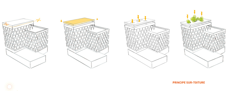 Les toitures des deux corps de bâtiment sont aménagées en terrasses en liaison avec les appartements des niveaux hauts. Ainsi, la toiture du R+5 est une terrasse accessible par les appartements situés au niveau R+6 dans le bâtiment le plus élevé. Pour ce dernier, la toiture est aménagée en terrasses abritées par une sur-toiture et accessibles depuis les appartements situés en dessous par des escaliers privés. Sur ces deux terrasses sont disposées des jardinières non enterrées faisant office d’acrotères et de séparatifs intérieurs entre les terrasses privées. La sur-toiture recouvrant la terrasse du R+7 est épaisse et sa massivité fait écho à l’aspect monolithique du projet. Reposant sur des poteaux, elle flotte et dessine une faille horizontale qui découpe le volume. Au-delà de l’aspect esthétique, cet aménagement permet la réverbération des rayons lumineux et la circulation de l’air. Cet effet de ventilation évacue l’air chaud stagnant par les percées de la sur-toiture; l’air frais s’engouffrant par les côtés est maintenu sous la sur-toiture par les arbres plantés dans les jardinières centrales. La face supérieure de la sur-toiture sera, comme demandé par l’atelier De Portzamparc traité avec une finition de coloris framboise.