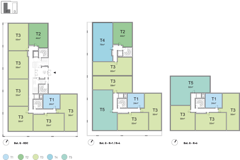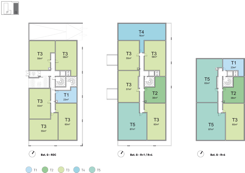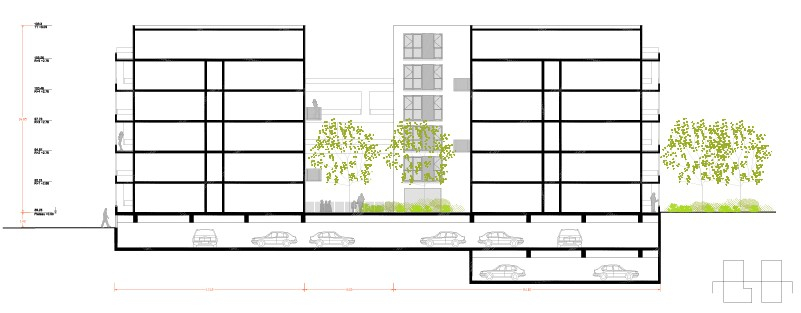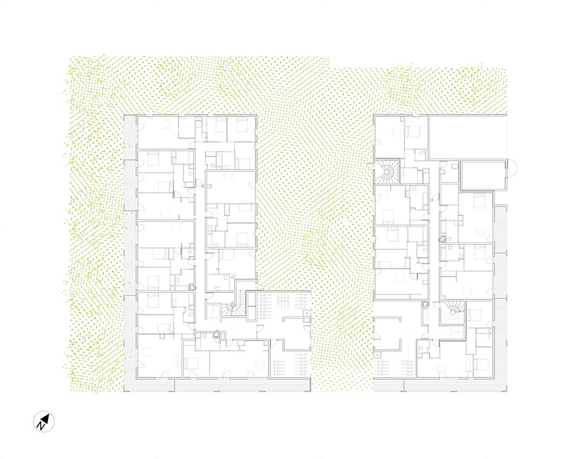 Les logements y bénéficient du calme en cœur d’ilot et de la vue dégagée sur l’espace paysager. Les surfaces vitrées s’alignent, en écho à l’aspect «tramé» de la double peau. Les balcons, pour la plupart, se décalent et s’alternent sur chaque niveau, pour offrir un effet « double hauteur ». Encadrés en totalité par les balcons, les surfaces vitrées offrent un un prolongement visuel direct avec les espaces extérieurs dédiés aux séjours. Le niveau rez-de-chaussée s’implante à la côte altimétrique 89.25. La déclivité de la voie 4 permet aux bâtiments de se détacher du sol en créant un effet de socle progressif, traité en fine maille métallique, qui en limite séparative côté rue Alexandra David-Néel se dilate et englobe le transformateur EDF et la rampe de parking. Les logements en rez-de-chaussée situés sur cette rue profitent du décalage avec l’espace public en le surplombant légèrement. L’accès aux halls d’entrés, depuis la voie 4 s’opère par une rampe à 5% dans la faille. Les halls des deux bâtiments sont axés et proches de l’entrée principale, afin de préserver la tranquillité des logements situés en cœur d’ilot des multiples déambulations des habitants. Les locaux communs tels que locaux cycles et local encombrants sont situés à proximité des logements. Un éclairage naturel et une ventilation naturelle, garantissent leur bonne utilisation par les habitants. La toiture sera végétalisée avec une couche végétale d’au moins 30 cm, renforçant l’isolation du bâtiment et participant à la rétention des eaux pluviales. Le projet comporte deux niveaux de sous-sol, dont un partiel, totalisant 89 places de parking, une zone de 580 m² de surface de pleine terre, ainsi qu’un local cycle. La chaufferie et les caves privatives sont situées au premier sous-sol. L’accès au parking s’opère depuis la rue Alexandra David-Néel en limite Nord-Est de parcelle.