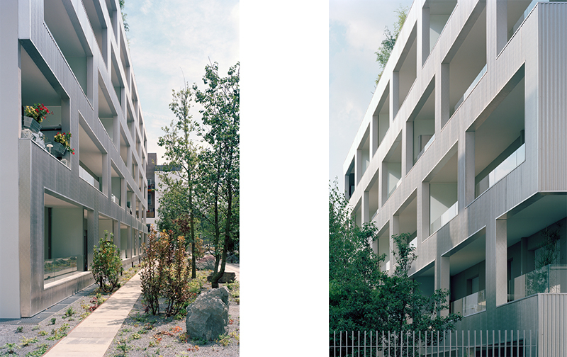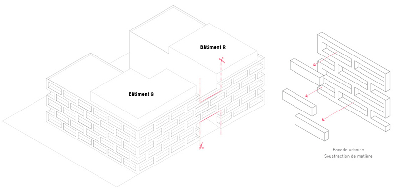 Q et R forment ainsi un bâtiment unique grâce à la liaison créée par la continuité de façade, de R+2 à R+4 ; ils sont ainsi perçus comme une seule entité évoluant sur le parcellaire. Le jeu des balcons et de la seconde peau, filants devant la percée, atténue également la verticalité de la faille, tandis que la porosité visuelle demeure, se fait plus rythmée et nuancée. La façade sur rue se profile telle une peau extérieure, une d’écorce protectrice, protégeant des nuisances sonores, participant au contrôle des apports solaires et à l’intimité des espaces extérieurs. Le revêtement en tôle aluminium ondulée, subtilement texturée, accentue cette perception. Par contraste avec la double peau métallique, qui reflète la lumière dans de douces ondulations, l’arrière plan des façades sur rues est traité plus simplement, en enduit fin taloché de couleur chaude dans des tons de bruns, assurant un aspect très lisse et homogène. Par soucis d’équilibre, entre un principe de façade qui s’appuie sur une alternance rigoureuse d’évidements et d’effets de masse, les garde-corps en verre feuilleté teinté en brun, apportent transparence et légèreté à l’ensemble. La définition des façades dans les parties intérieures de l’ilot est également plus simple et plus lisse, elle reprend la teinte brune de la façade extérieure en enduit.