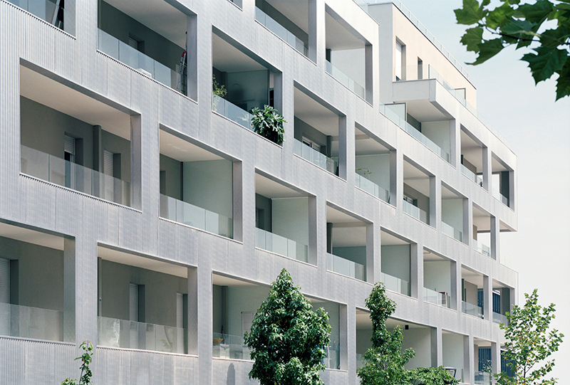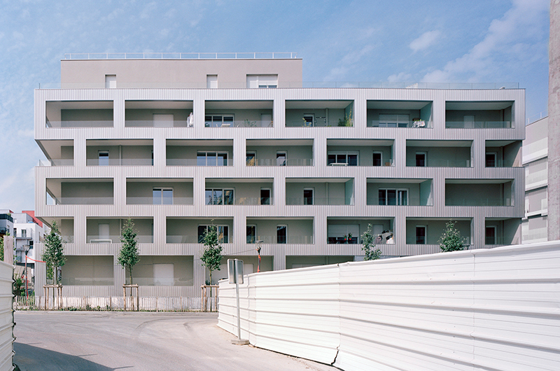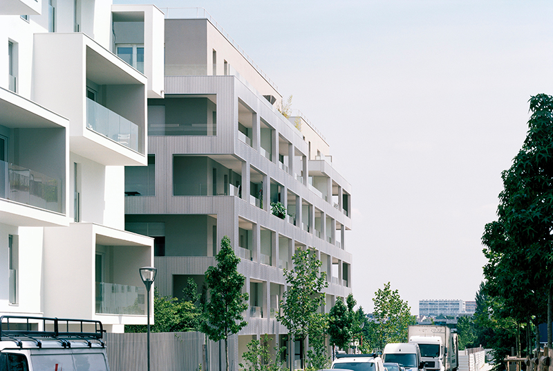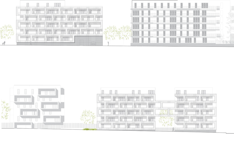 Le projet présente une bande de balcons de 1,50 m de profondeur, filant sur tout le linéaire de façade des deux rues qui le ceinturent et le long du mail piéton. Ces façades fondamentalement urbaines proposent un traitement lisse et uniforme par l’habillage du volume d’une paroi percée de grandes ouvertures horizontales. Conçue comme une double peau ajourée, elle enveloppe et réunie les deux bâtiments dans un traitement unique des façades à caractère urbain. Cette stratégie architecturale, tout en offrant une grande qualité de vie aux futurs habitants, permet de donner une autre échelle à la façade, un aspect généreux et qualitatif, celle-ci n’étant pas conditionnée par le dimensionnement normatif des baies de chaque logement. Les bâtiments s’implantent à l’alignement sur la voie 4 et la rue David Néel grâce au principe des balcons, tandis qu’ils opèrent des retraits en limite séparative. Sur la voie 4, la percée visuelle propose une échappée visuelle vers le cœur d’ilot et marque un accès paysager depuis la rue vers les halls d’entrée. Le principe de balcons filants en double peau, se prolonge et se dilate dans l’espace de la faille entre les deux bâtiments, afin d’offrir de généreux prolongements extérieurs aux logements situés aux angles et créer une unité de façade.