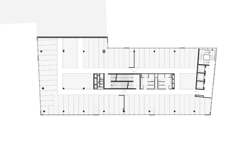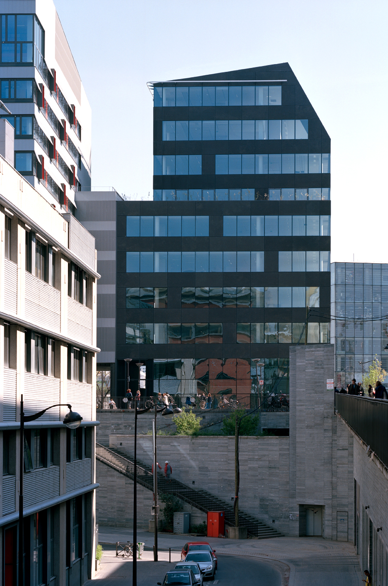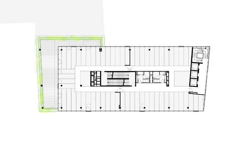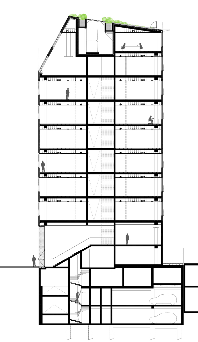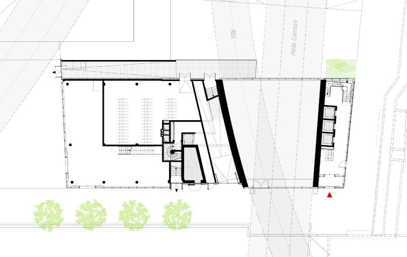A l’extrémité ouest face au square public, un pan tronqué sur les quatre niveaux supérieurs dégage une large terrasse venant se caler parfaitement avec la volumétrie du bâtiment voisin – jeu architectonique parfaitement relayé par une liaison en partie basse mettant en relation la placette de la Petite Ceinture à l’est et le square public à l’ouest.