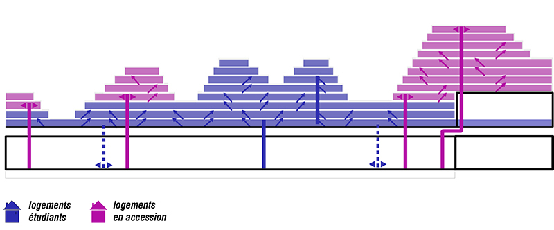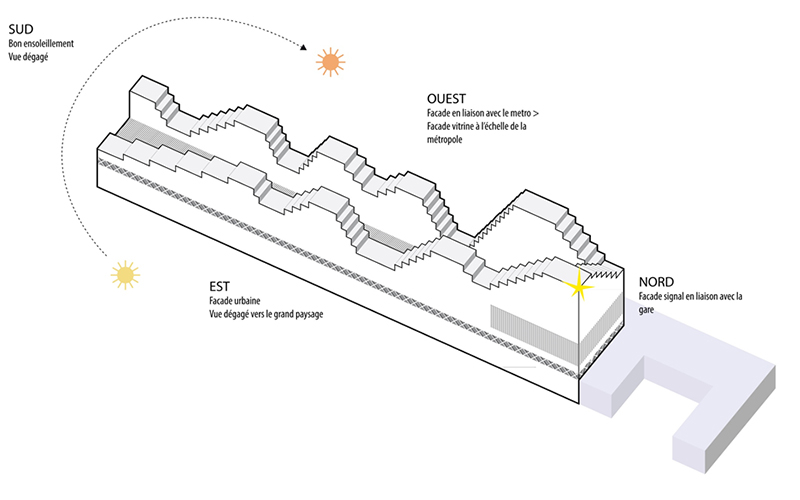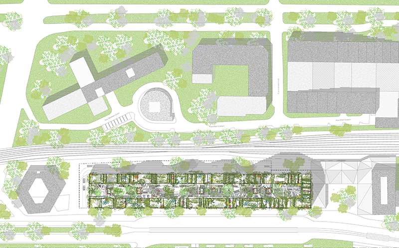 La façon dont est modelé le paysage témoigne. Cette histoire a une valeur patrimoniale et, même si le quartier se transforme, la structure du paysage s’inscrit dans une échelle de temps et de territoire élargie. C’est donc à partir d’un parc qui viendra définir le skyline, proposer un contour, définir les limites entre un morceau de ville et le ciel que nous modelons le bâti. Le jardin se déploie pour venir culminer à l’aplomb de la gare telle une falaise de strates géologiques superposant, mêlant, connectant : espace public, parking, logements étudiant, bureaux, logements familiaux – véritable tranche de vie, tranche de ville où la mixité programmatique est donnée à voir comme fondement du projet. La ville attractive dans sa complexité et sa diversité annoncées comme principe de façade, constituent ainsi la matérialité de la façade principale, le point de départ d’un nouveau quartier.