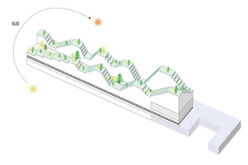 Nous envisageons notre proposition comme un paysage, un paysage urbain, un paysage habité à l’échelle des enjeux du Grand Paris, à l’échelle de la ville, inscrit dans les mutations que vivent nos territoires. Notre projet est avant tout une topographie, une géographie, un paysage qui se déploie en une chaine de montagne constituant un panorama, un jardin suspendu qui vient, en douces vagues se développant crescendo, annoncer le point d’une infrastructure majeure du 21ème siècle.