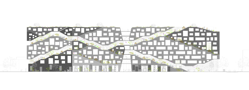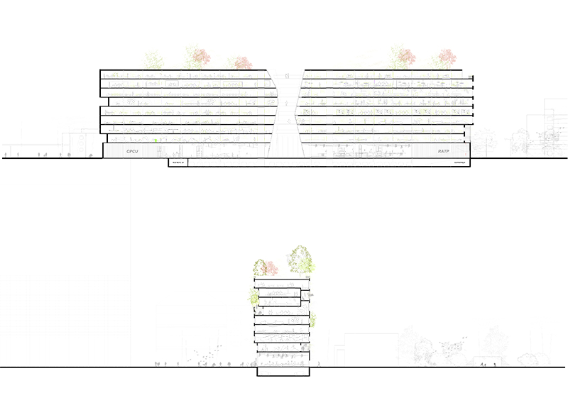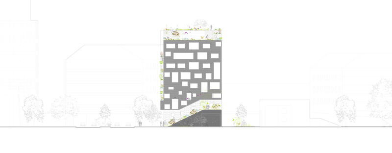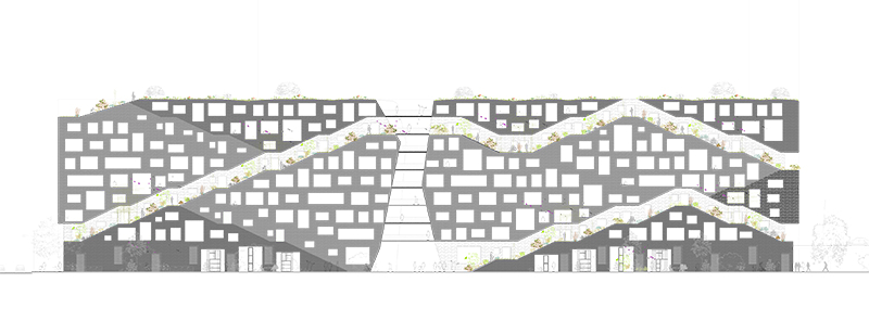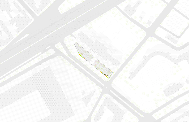 Le projet a été pensé comme élément d’un territoire, comme une intervention à même de fédérer un site distendu par l’emprise d’infrastructures sportive, routière, par la distance instaurée par la grande verticalité. Lieu hors du commun de la ville, cette lisière longtemps en jachère, appelle une architecture ambiguë où la ville et un parc se mêlent au travers d’un paysage vertical fait de minéralité et de végétal naturellement complémentaires.