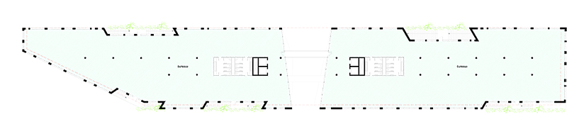 2 blocs, 2 rochers sculptés, facettés, taillés comme on polirait des pierres précieuses, 2 fragments issus d’une provenance commune, disposés sur le parvis des abords sud du périphérique, là où la ville se relâche et commence à se distendre. L’espace, le vide, la vacuité induite par l’emprise d’un stade, par la largeur de la place ceinturant le TGI, par le périph et ses abords sont révélés par la singularité morphologique d’un projet mi architecture, mi paysage. La spatialité de ce territoire sertie entre les maréchaux et périphérique est avant tout une aventure paysagère, le vide concours à son attractivité, minéralité et végétale, architecture et jardin intimement liés à la singularité d’une entrée de Paris.