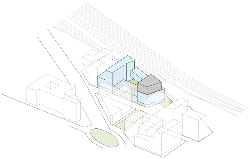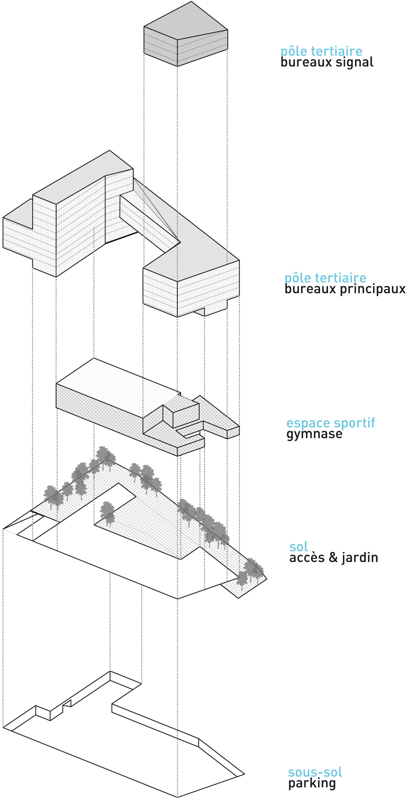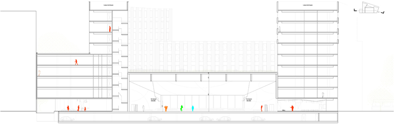Aussi le projet joue-t-il sur deux registres : l’un dans son rapport au sol avec une recherche de multiplicité de fenêtres urbaines mettant en relation la rue et le grand paysage, l’autre dans la fragmentation de la silhouette de l’ouvrage afin d’offrir un skyline ciselé et ouvert.