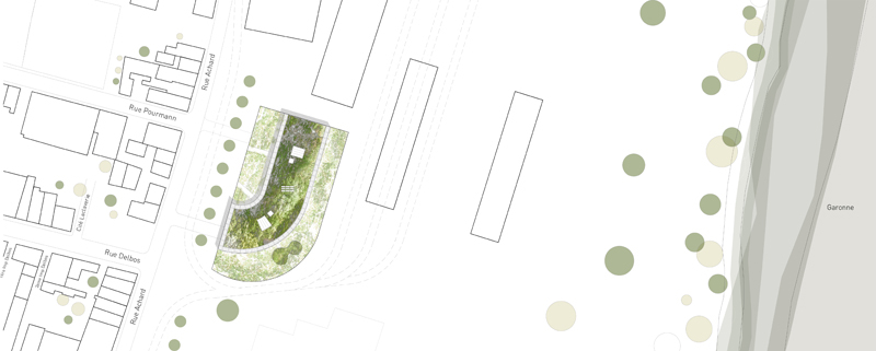 Notre proposition est un travail sur les usages dans lequel l’individu est au centre de nos préoccupations, notre objectif est de permettre à chacun d’interagir de façon simple et naturelle avec son environnement. La densité et la compacité sont envisagées comme des valeurs essentielles. Le bâtiment a un volume simple, trapu, qui reprend la morphologie de la parcelle en décrivant un arc de cercle, décuplant ainsi les surfaces de façades orientées au sud, vers la Garonne et ses berges. Le bâtiment en lévitation sur des pilotis libère la vue sur un fond végétal. Ce choix architectural permet de répondre à la contrainte d’inondabilité et également de proposer une mise en scène des arrivées dans le bâtiment. Les scénarii de vie sont au cœur de notre réflexion et le projet découle de la mise en place de ces nouveaux usages dans le travail; nous souhaitons faciliter l’utilisation des modes de transport doux et privilégier la relation intérieur-extérieur. Pour cela, chaque bureau s’ouvre entièrement sur de vastes balcons. Le végétal est une véritable composante du bâtiment, l’aménagement du rez-de-chaussée est dissout dans une logique paysagère. Le jardin, traité comme une noue vient capter les eaux pluviales. Un filtre végétal vertical protège le bâtiment du soleil en été et s’efface en hiver grâce à ces feuilles caduques.