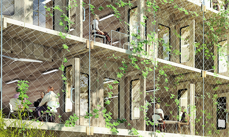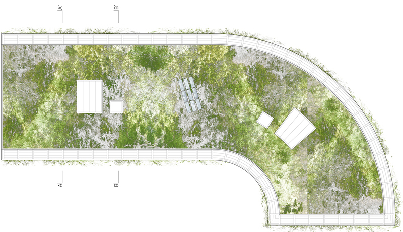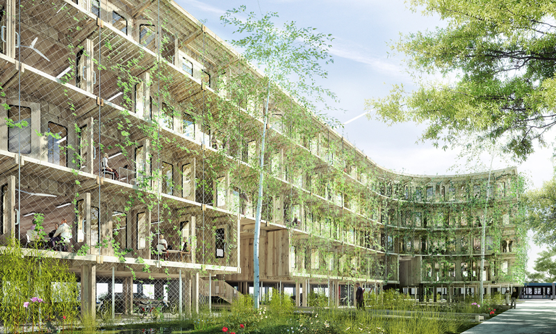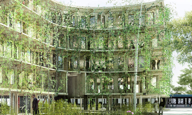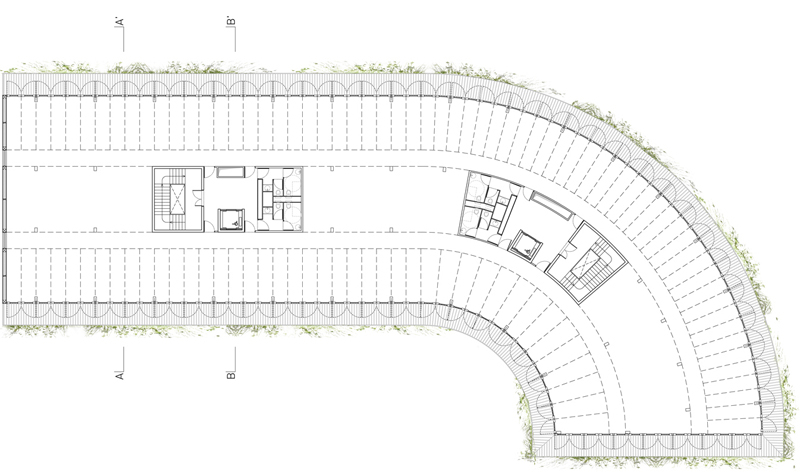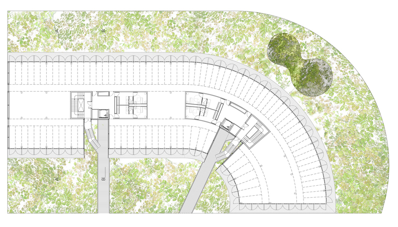 Our proposition is a work on the uses in which the individual is in the center of our concerns, our objective being to allow everyone to interact in a simple and natural way with its environment. The building has a simple volume, which follows the morphology of the plot by describing an arc of a circle, increasing the surfaces of south facades, towards to the sight on the Garonne River. The Building, in levitation on stilts opens the sight on a green backside. This architectural choice allows to answer the constraint of this floodable plot and also to propose different ways of entering the building. The life is at the center of our reflection, and the project ensues from the implementation of new practices in working; we wish to facilitate the use of ecological transportation and to privilege the relation inside-outside. For that purpose, every office opens completely on a vast balcony. The green is a real componant of the building, the design of the ground floor is integrated in a landscaped logic. The garden is treated like a hollow in the ground in order to drain rainwater. A vertical plant filter protects the building from the sun in the summer, and fades in the winter thanks to its deciduous leaves. In the project, the elementary and structuring technical choices are low-tech. The technology is used to simplify and use the energy consumptions better. The constructive choices are simple in order to guarantee a clean building progress, fast construction site and without excavation: a building on piles, a wood structure, natural wood facades with prefabricated opening doors, over-insulated, and concrete floors to strengthen the inertness of the building. This project illustrates our conception of the sustainability: above all, the solutions must focus on the uses and in our capacity to generate natural complicities between a building and its users.