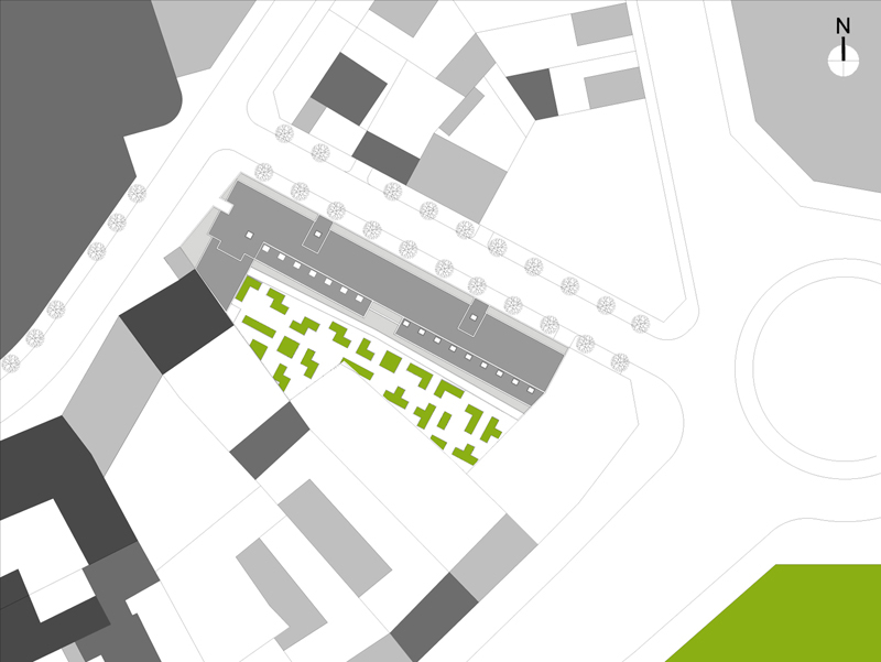 L’accès à la résidence se fait par une fente prolongée par les circulations horizontales coupant en deux le bâtiment dans sa longueur, ligne de partage, articulation entre le coté nord et le coté sud, transition entre l’aile de la construction donnant sur la rue Carême Prenant en vis-à-vis de bâtiments existants, et une façade ouest ouverte sur le hall et le jardin faisant face à la brique du centre commercial de la ZAC. La façade ouest est suspendue au-dessus du hall, les modules sont décomposés dans une géométrie hybride. Le bâtiment  fait le grand écart pour trouver une urbanité dans un paysage composé d’un mur de brique R+4 compris accès parking, des logements style Ile-de-France, un transformateur EDF habillé d’un fronton antique et un petit hôtel particulier conservé dans le cadre de la ZAC. Coté sud, à l’intérieur de la parcelle, les logements sont prolongés de balcons de 8 à 15 m², surfaces à vivre assez larges pour sortir une table.