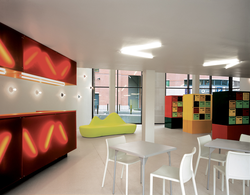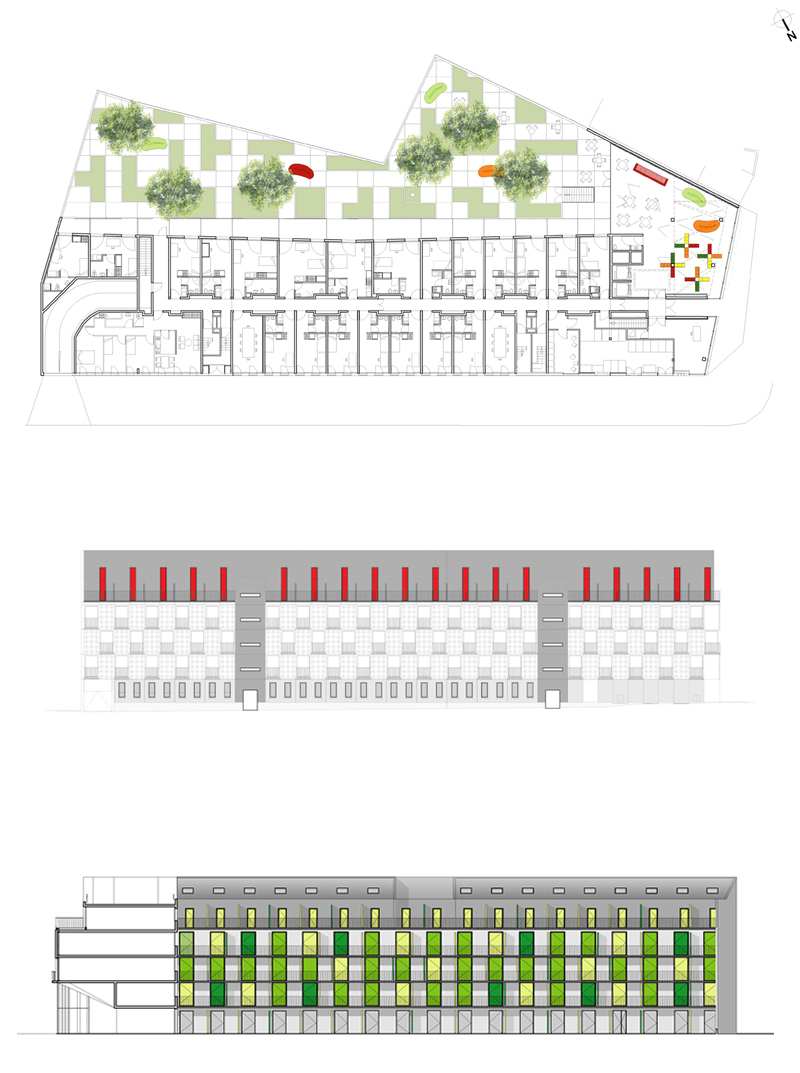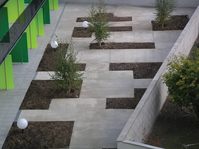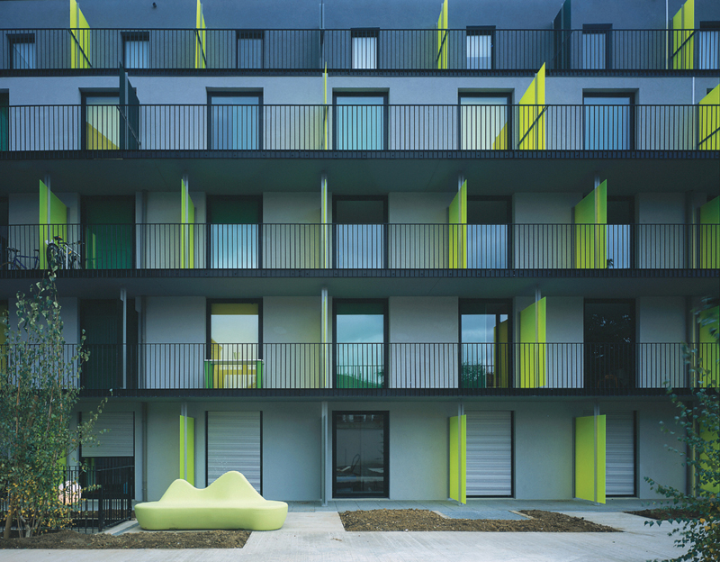 Une façade rythmée à part égale de vides et de pleins, grise, tramée, neutre, fractionnée par des séparatifs colorés générant des halos teintés venant jouer avec les volets colorés des logements. Au sol le jardin Tetris, dalle de béton balayé ponctuée de formes géométriques plantées d’un tapis de mousse épaisse (plantation novembre). Même syntaxe que pour la façade sur rue avec un vocabulaire différent, évocation artificielle d’un paysage qui se voudrait plus naturel. Un hall – interface entre la rue, les circulations, le jardin. A droite, des boites aux lettres, dédale coloré avec l’envie de se perdre pour un minimum d’intimité (face aux boites, le préposé de la poste a demandé sa mutation), plus loin un bar prolongé par un jardin. Une buanderie – pièce à vivre, lieu de discussion, de drague et de rencontre qui doit être peinte en orange, meublée d’un canapé, d’une machine à café. A venir. De longues circulations horizontales fonctionnelles, des portes palières, alternées avec des portes de gaines – accès directs à la technique des logements. A une extrémité une baie toute hauteur, toute largeur. Les zones de circulation sont réduites à minima. Paradoxalement, la trame et la rigueur de composition des façades permet de nombreuses combinaisons de logements avec 113 typologies différentes sur les 164 logements de la résidence. Les appartements font de 17 à 40 m² avec des simplex et des duplex.Façade vitrée à 50%, moitié vide, moitié plein avec un volet tableau coulissant. Perpendiculairement à chaque baie un séparatif coloré…