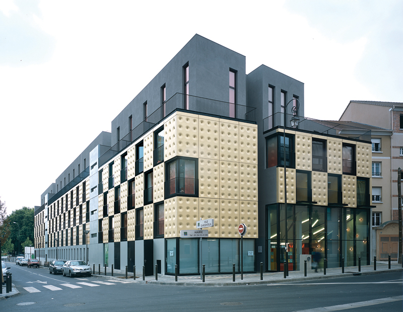 164 logements sociaux pour étudiants. Des logements dédiés à des résidents au profil défini, homogène, même âge, même éducation. Les façades mettent en scène ce programme monolithique : au nord une trame comme dénominateur commun, module d’appartement répétitif de 320 x 275, partition des surfaces de façade égales, parfaitement réparties. La somme est constitutive du projet. Rythmique répétitive, raide, séquencée, syncopée comme autant de possibilités d’échapper à la fatalité de la répétitivité. La façade est 50 % plein, 50 % vide, angle sur angle, en damier, faite d’alternances, abstraction des murs et des planchers. Chaque logement bénéficie de 50 % de clair de jour en un vantail toute hauteur, toute largeur, pouvant être occulté par un volet coulissant intérieur. Volet imprimé du motif pixelisé de la façade, rouge-or, celui-ci vient complexifier la perception du carroyage depuis la rue et sert dans les logements de “tableaux noirs” de travail aux résidents. Tableaux magnétiques sur lesquels on peut écrire au feutre, coller textes et images.