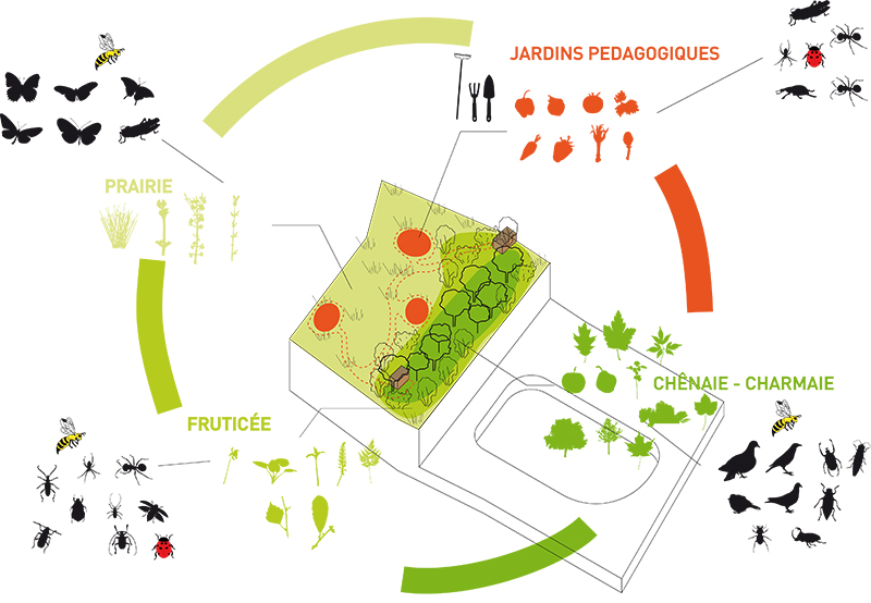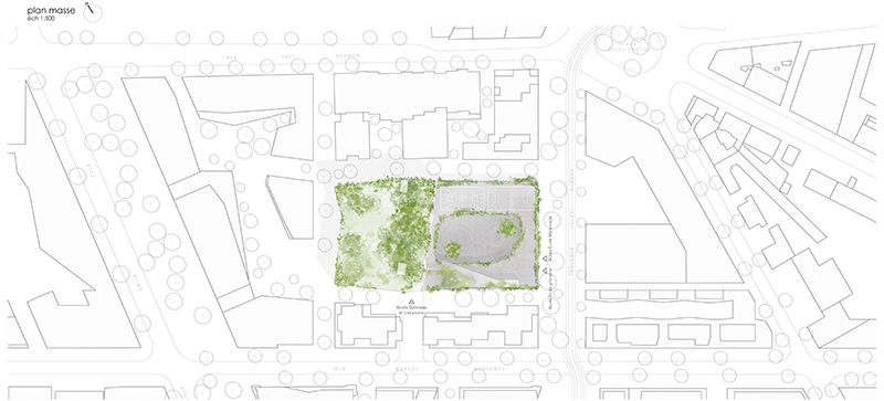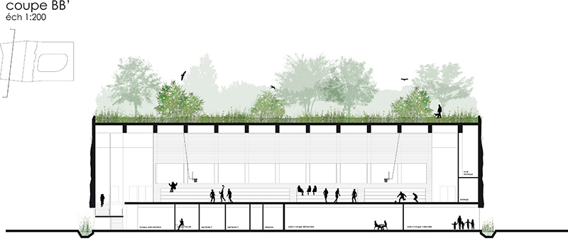 La réalisation du groupe scolaire et gymnase est l’occasion de repenser un milieu, de mettre en place un biotope, de retrouver les composantes d’un éden perdu. Notre proposition est donc avant tout paysagère : l’architecture et le programme sont asservis à la mise en œuvre d’un paysage, à la définition d’un cadre de vie. Il s’agit de répondre aux nouvelles attentes quand nous voulons les services de la ville et les avantages de la campagne. Notre projet se trouve en équilibre entre la production d’une géométrisation architecturale de l’espace conçue à partir de la géométrie euclidienne pour définir les caractéristiques de l’espaces rationnels des programmes d’enseignement, et le déploiement d’un principe narratif dont le fil conducteur est l’évocation de la place de la nature dans la ville développé à partir d’éléments naturels et par essence évolutifs. Par-delà les considérations environnementales qui sous-tendent notre travail, il y a une réflexion sur l’incertitude, sur l’acceptation de perte de pouvoir sur ce qui touche à la nature et à ses phénomènes incertains. Il en résulte un abandon de la volonté de contrôle total de toutes les composantes d’un paysage organisé autour de l’idée du naturel. Travailler avec la nature, c’est mettre en scène de l’impondérable, des événements inattendus. Nous vous proposons donc deux approches croisées : l’une rationnelle portant sur la mise en œuvre d’un programme scolaire, l’autre portant sur la mise en œuvre d’un équilibre d’éléments naturels, d’un devenir que nous ne contrôlons pas complètement et sur lequel nous pouvons seulement influer. Il y a donc un projet architectural dessiné, mis en œuvre de techniques et de contraintes, et un projet itératif, incertain, mouvant, libre, principe narratif autour de l’idée de la nature.