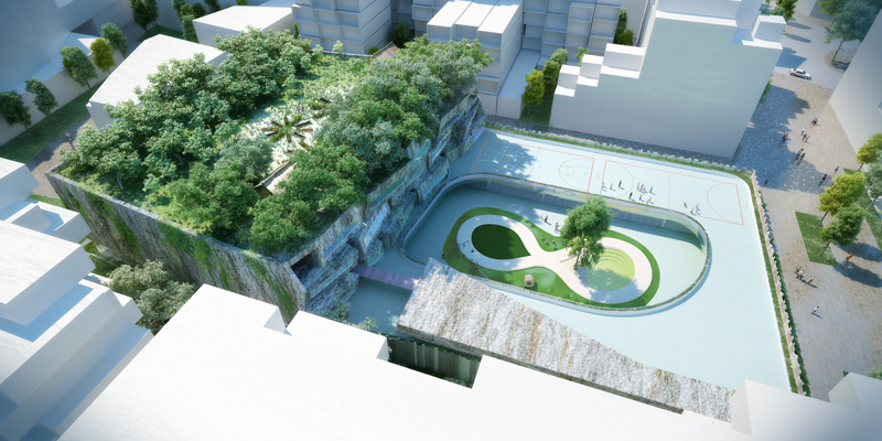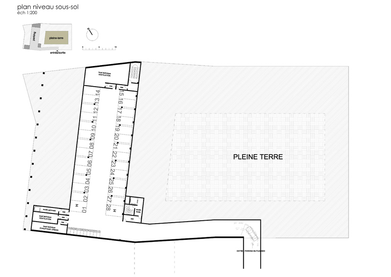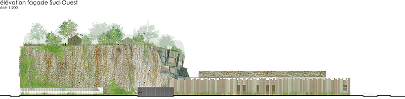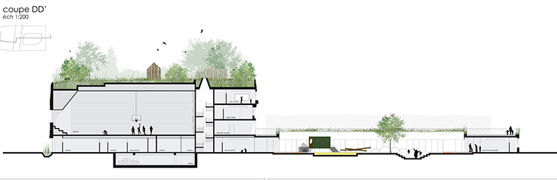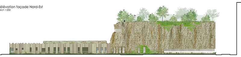 La volumétrie du projet est scindée en deux blocs, deux éléments simples, bruts. L’un s’apparente à une motte de terre arraché au terroir, masse de béton de terre. Il contient le gymnase, l’espace restauration et les classes de l’école élémentaire. C’est un volume sculpté, révélant la densité de la matière à la minéralité affirmé, avec un aménagement en son sein quasi troglodyte. L’autre, plan, allongé, est une enceinte, une palissade de bois équarri. Le bâtiment est ceinturé par des noues, par une frange de l’espace public incertaine légèrement humide, colonisée par des plantes captant les eaux pluviales. Cette limite naturelle instaure une distance, un filtre végétal entre la ville et un lieu qui requiert intimité et calme. En toiture, l’eau de pluie est captée par les surfaces végétales, sur les façades elle accroche le relief la texture rugueuse de l’enveloppe, permettant l’émergence de mousses et de plantes opportunistes. Les façades sont colonisées par des amorces d’habitat, des reliefs, cavités, des failles aptes à accueillir des insectes et volatiles.