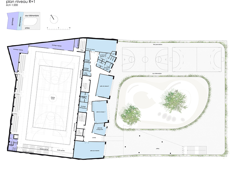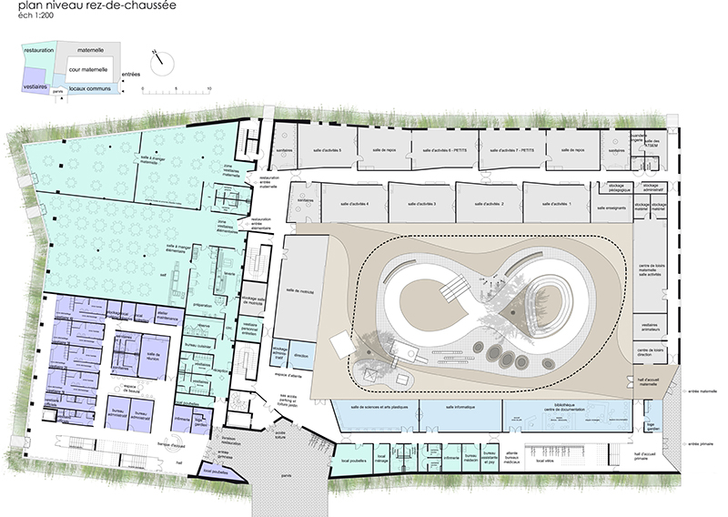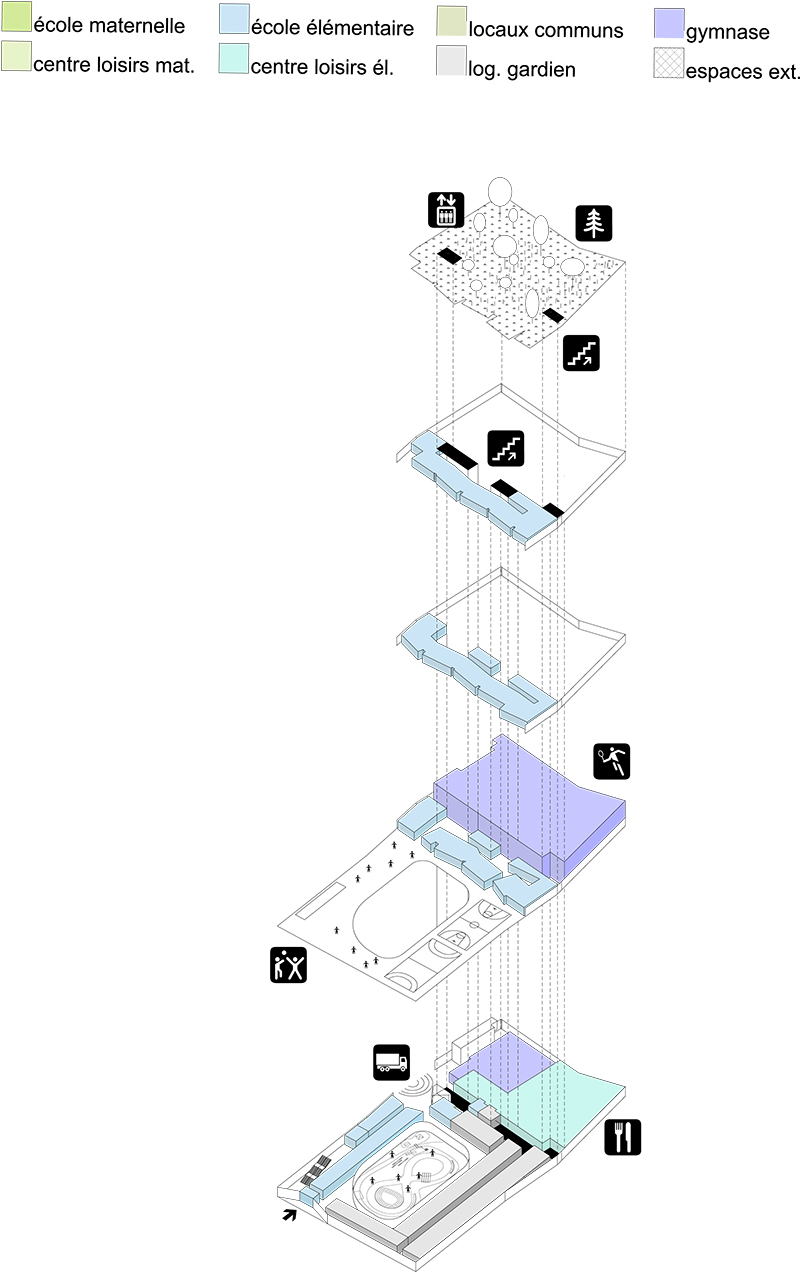 Le programme s’articule autour de 3 grandes entités : le groupe scolaire avec l’école maternelle et l’école élémentaire et enfin le gymnase. L’école maternelle est de plain-pied, organisée autour d’une vaste cour ceinturée par les salles d’enseignements. Il en résulte un univers protecteur, complètement déconnecté des contingences de la ville pour former un lieu intime organisé par le vide et la lumière. Les aires de travail et de détente forment un tout, leurs complémentarité fait sens dans la définition d’un territoire dédié à la pédagogie. L’école élémentaire située en étage est desservie par un large escalier en pente douce. Les espaces d’enseignement viennent s’adosser au volume du gymnase, chaque classes est individualisée, identifiée en façade. Le gymnase, sur deux niveaux, développe son grand volume libre au creux de la motte de terre, s’ouvrant par une grande fenêtre horizontale, source de lumière du nord, idéale pour l’usage sportif.