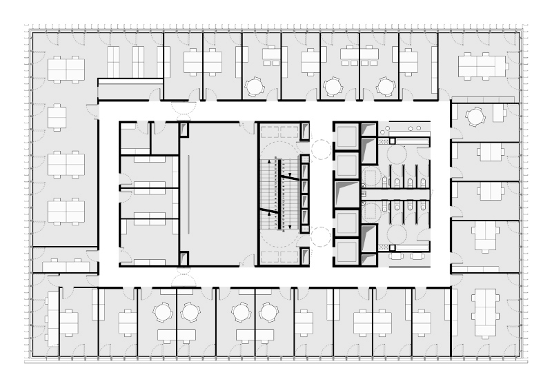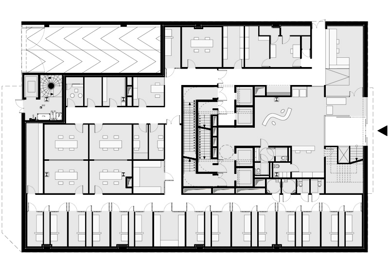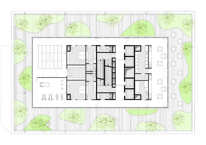 Cette recomposition nous permet de reprofiler le dernier niveau en attique, abaissant visuellement le gabarit de l’ouvrage, dé-saturant ainsi la relation du bâtiment à environnement, caractérisé par un contexte résidentiel dense. Au dernier niveau nous libérons une large terrasse végétalisée, surface plantée, accessible, ouverte sur la ville.