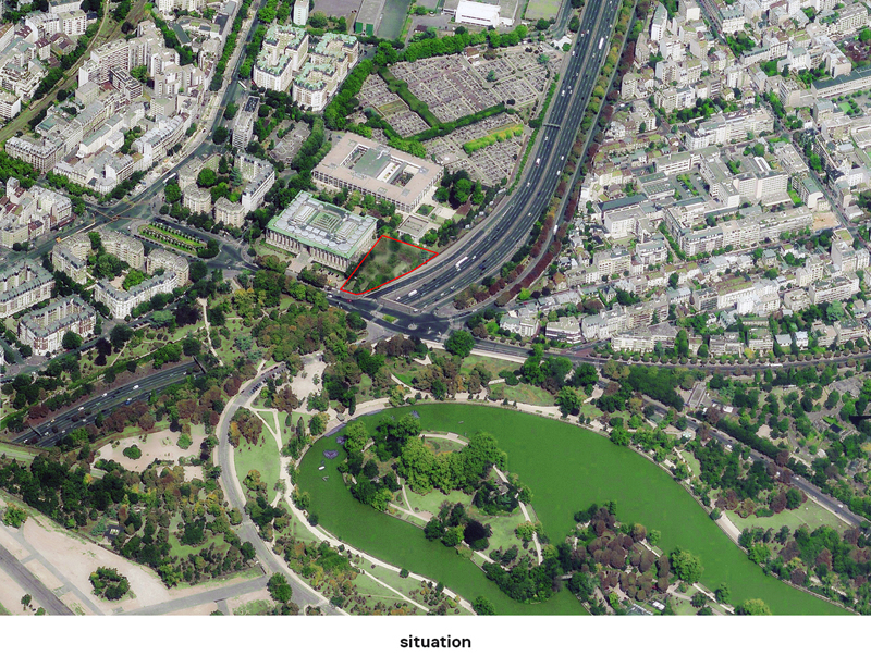 Le Palais de la Porte Dorée est phagocyté, ceinturé d’arbres et de plantes, avec pour vis-à-vis l’amorce d’un territoire forestier. Le bâtiment est autonome, chacune de ses façades en relation avec des massifs arborés. Cette position insulaire, garantie par le sertissage d’un écrin végétal, est à préserver impérativement. Nous sommes en présence de corridors verts denses, étroitement imbriqués dans un paysage parisien, véritable patrimoine qu’il s’agit de renforcer. Dès lors, consommation du territoire et rapport au sol sont des questions centrales.