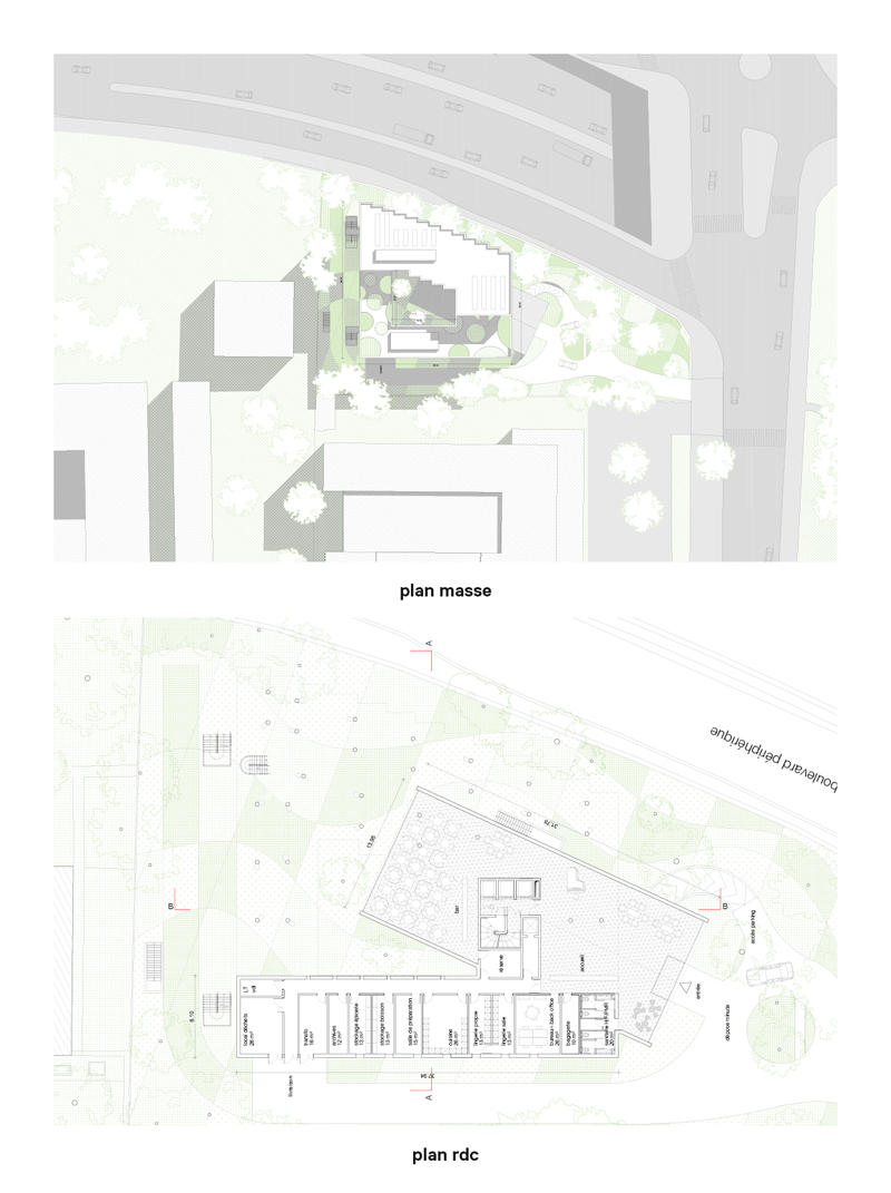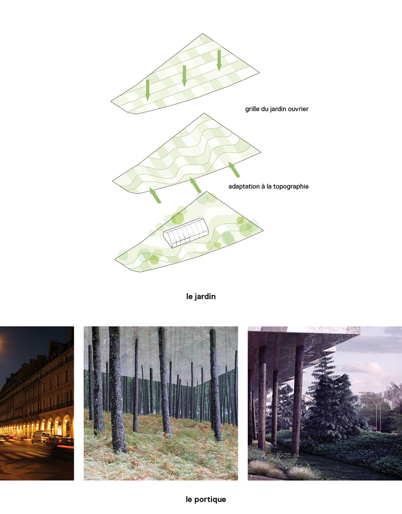 Le Palais de la Porte Dorée induit un paysage, une écologie urbaine et une position historique qui font autorité. La question de la présence et de l’autonomie du Palais sont des éléments structurants du site, aussi nous implantons l’Hôtel en retrait de la voirie afin de préserver un filtre végétal aux abords du bâtiment. L’Hôtel, ainsi volontairement en retrait, se situe dans un second plan afin de conserver tout le déploiement de la colonnade de Laprade. Les surfaces à RDC de l’Hôtel sont réduites a minima, en totalité attribuées aux surfaces d’accueil et celles des services les accompagnant. Il s’agit de dé-saturer la consommation du sol afin de laisser se déployer le plus largement possible ce corridor vert le long du boulevard et proposer une urbanité en accompagnement du périphérique qui préserve le long linéaire planté qui le caractérise tout en affirmant des espaces de résidences en bordure de ce qui tend à devenir un boulevard urbain. Il s’agit d’imbriquer minéral et végétal, construire sans saturer, proposer un jardin, habiter, libérer le sol, avec la conviction que seul un paysage ouvert, poreux, arboré sera à même de participer à la qualification d’une infrastructure tellement parisienne.