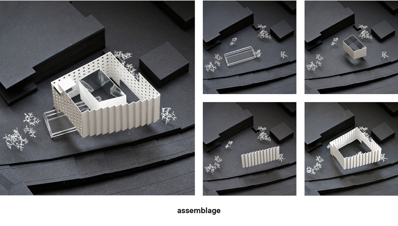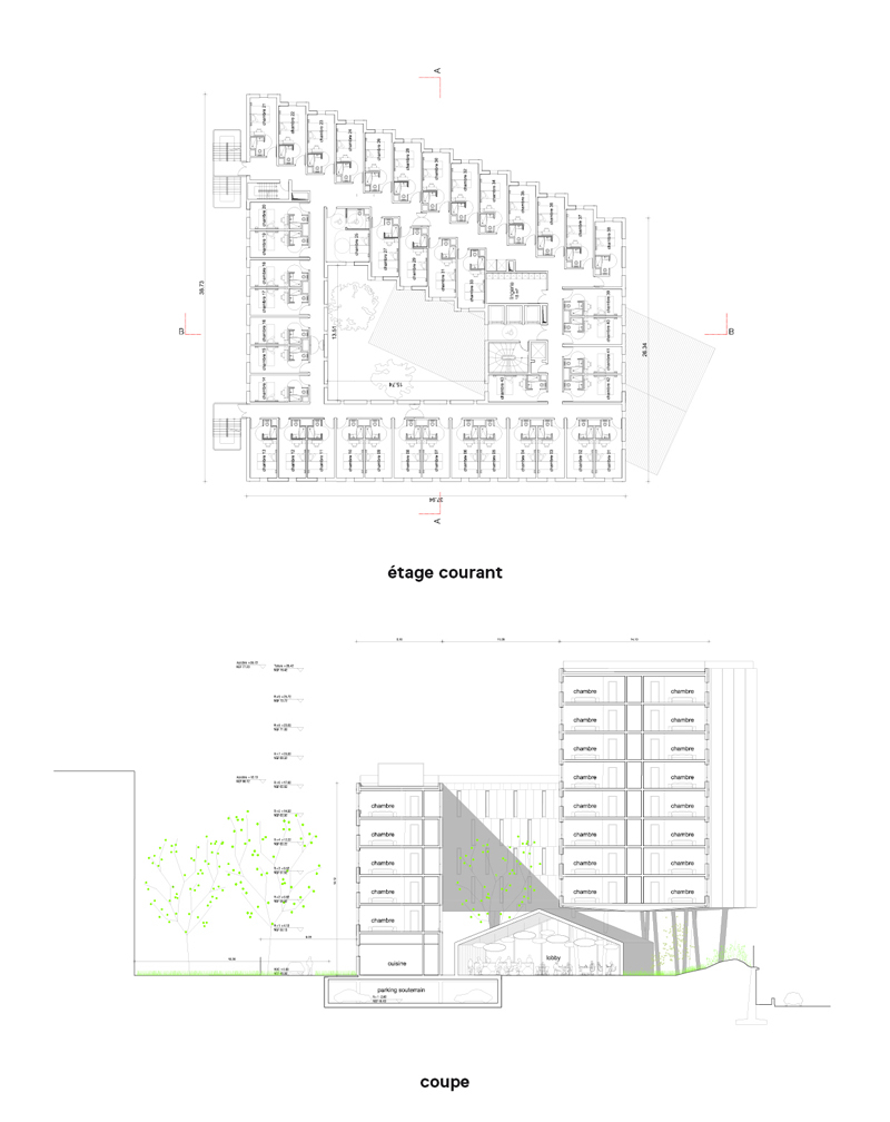 Le bâtiment affirme son autonomie, son insularité, une mise à distance respectueuse par rapport à l’architecture de Laprade, mais affirme aussi des filiations ou tout du moins un accompagnement discret. Aussi est-ce dans un registre minéral que nous proposons les volumes des espaces de nuit. Un bloc minéral rythmé, séquencé mettant en scène la répétitivité du programme dans une composition rigoureuse, géométrisée. Figure de façade mosaïque, l’enveloppe est en béton architectonique au calepinage cyclopéen. Dans la continuité d’un registre ornemental de rigueur, les panneaux sont striés de fines arrêtes comme autant d’éléments pour accrocher ou diffracter la lumière. On retrouve mimétisme et similitude : les matériaux, les couleurs, les formes procèdent d’un même ADN. Jeu de facettes en béton texturé lasuré qui absorbe ou réfléchit, reflète par des jeux de brillance des fragments d’un volume, visible, lisible par-delà les voies du périphérique. Bétons aux finitions mates, satinées, réfléchissantes, s’entremêlent par un jeu d’assemblages subtils : présence et disparition évoluent au gré des déplacements. Deux escaliers métalliques, spirales métalliques sculpturales en référence directe à la maison de l’Iran marquent la façade nord : « La rigueur du tracé joue en contrepoint avec les spirales inversées de l’escalier » Claude Parent.