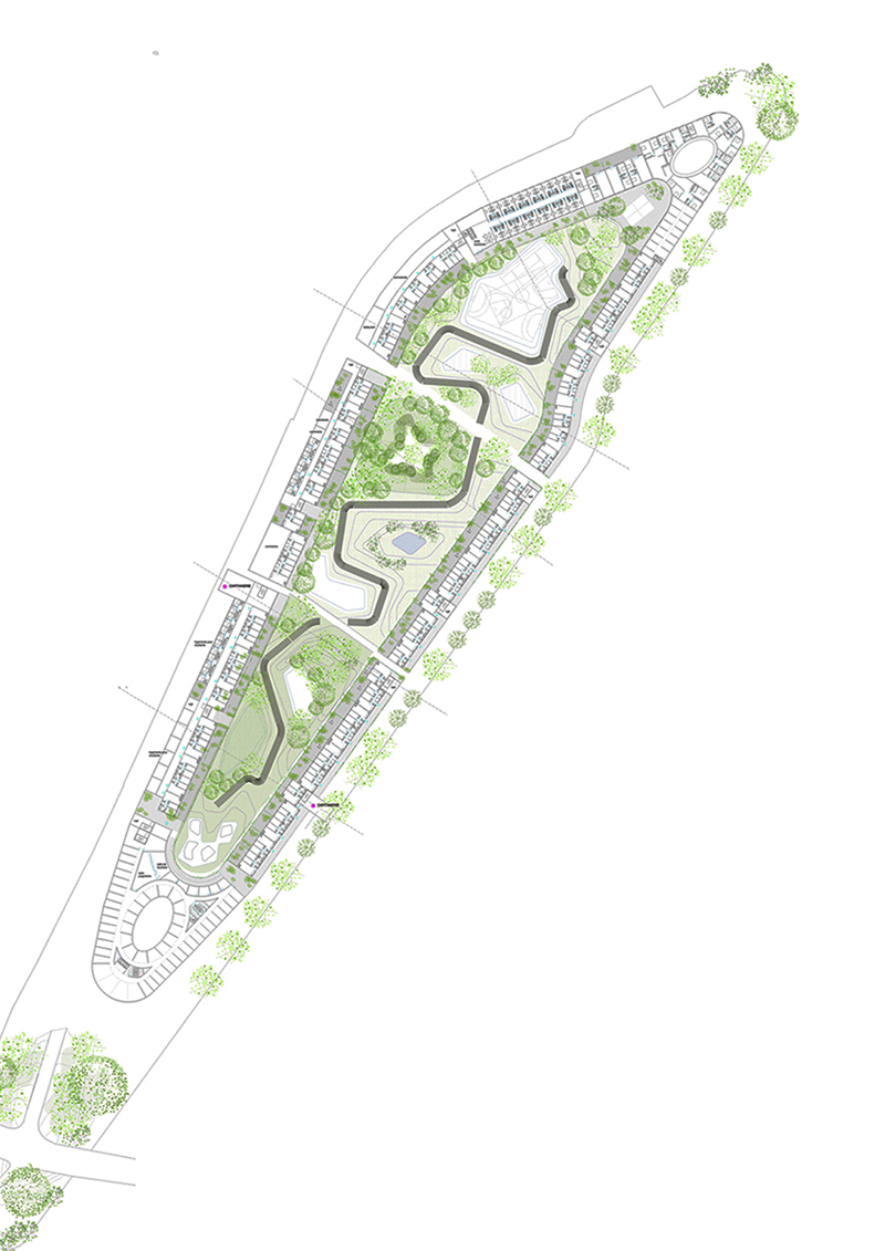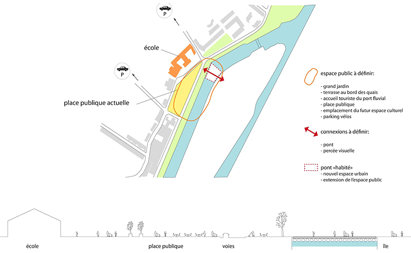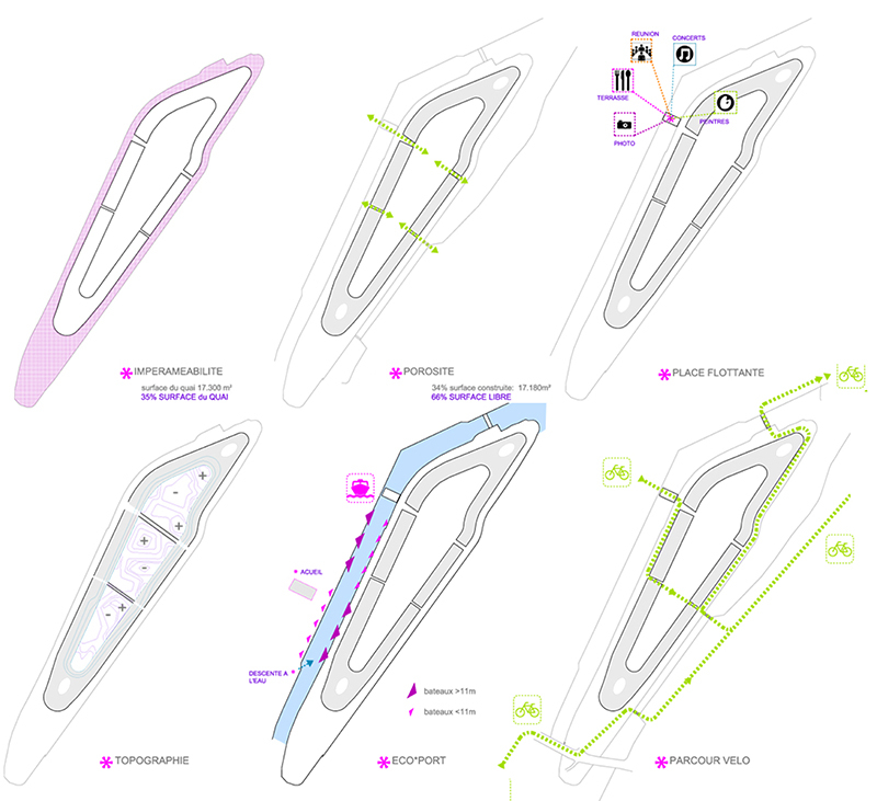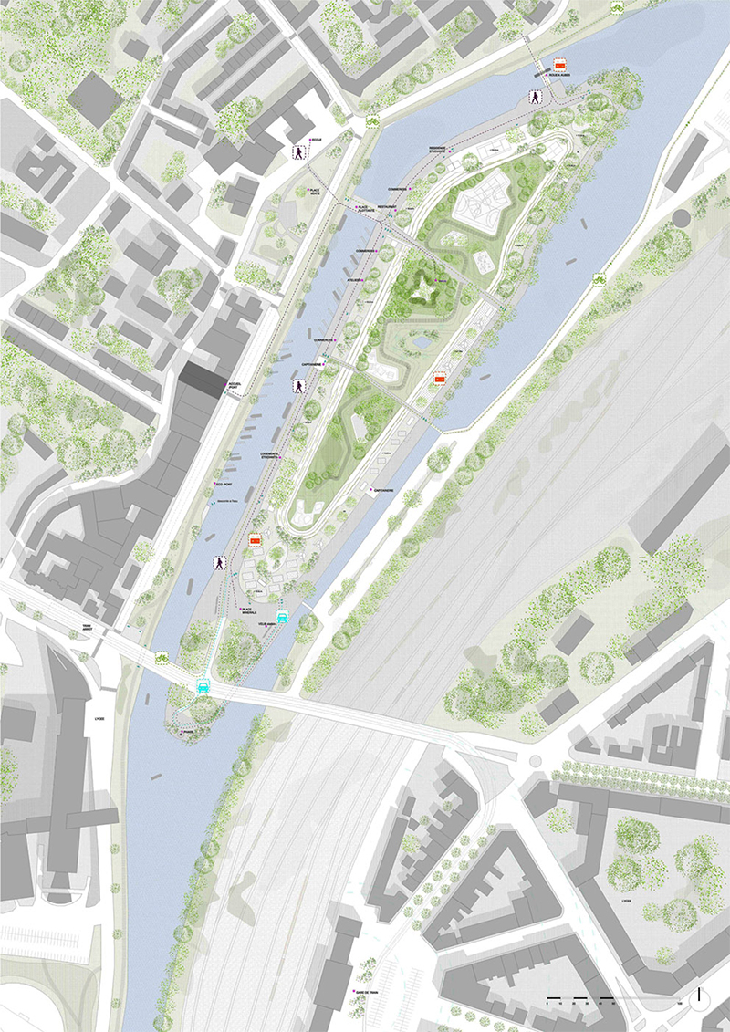 La diversité, la complexité, l’imbrication des rythmes d’activités ou d’usages sont évaluées et assemblées afin d’instiller les conditions nécessaires à la réalisation d’un environnement moins linéaire, plus incertain, n’excluant pas des mutations à venir ou des intentions prospectives que nous pensons propres aux villes attractives. Ainsi l’ile accueille, logements en accession, logements locatifs, logements pour séniors, logements étudiants, des espaces tertiaires, petits locaux d’activités, un éco-port, quelques commerces de proximité, un restaurant qui s’ouvre sur le pont flottant, ainsi qu’une crèche. Cette diversité programmatique permet la mise en œuvre d’un quartier dense et attractif. L’organisation projetée du site est déclinée d’une certaine idée de la place du paysage dans la ville. Du micro au macro, du paysage du jardin au paysage de la ville, l’urbanisme s’articule en allers-retours non pas à partir de la dualité plein-vide mais dans la conscience de s’inscrire dans un continuum paysager dont il convient d’impulser les qualités, dissoudre les contraintes dans la mise en place d’un projet inscrit dans une vision élargie du territoire en phase avec les attentes de notre époque : Peu ou pas de construction en infrastructure pour des constructions optimisées en termes de coût, de délais de réalisation, pour un plus grand nombre, pour un plus large choix d’options de vie. Ainsi les espaces non construits sont mutualisés pour l’essentiel, avec pour intention de réduire le cout des VRD et les couts d’exploitations induits.