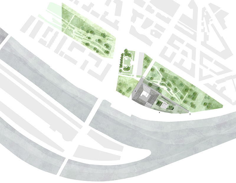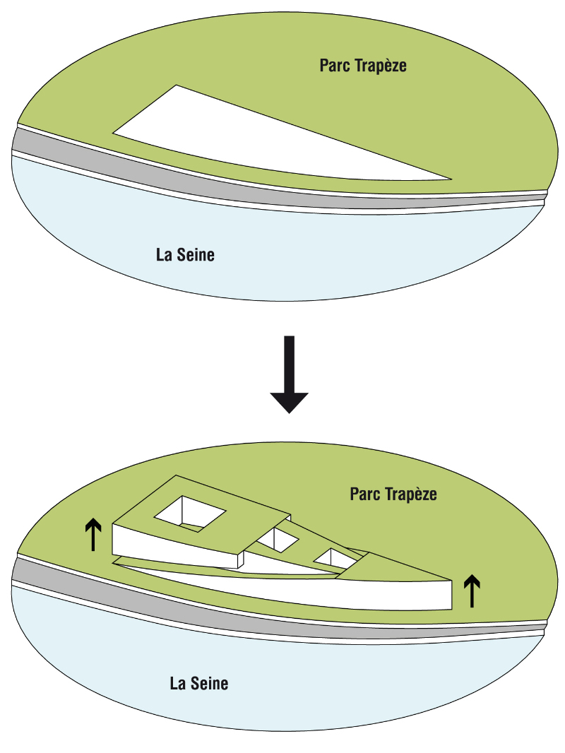 Forts de ce constat, nous avons déplacé le centre de gravité de nos projets vers le Nord-Ouest de la parcelle afin d’établir une filiation avec les bâtiments qui longent le quai, mais surtout de ne pas générer un effet de proue qui rentrerait directement en concurrence avec celle de l’Ile Seguin. En effet, la proue de l’Ile Seguin a une légitimité géographique qui ne laisse aucune place à ce qui serait de facto un ersatz. La forme de la parcelle, ce triangle arrondi ne constituant pas une proue en soi, toute analogie à la batellerie serait donc fortuite. D’ailleurs un trapèze n’a pas de proue. Dès lors nos projets ont été conçus pour permettre le cadrage de vues et de perspectives, en mettant en œuvre, à la jonction du parc et du quai, une ligne de partage du paysage. Les exigences du programme nous ont conduits à concevoir deux projets de natures différentes, structurés par deux approches distinctes d’assurer la sécurité des personnes et des biens. Réfutant tout a priori formel, nous avons choisi de développer deux projets, deux conceptions structurées par deux possibilités réglementaires d’organiser la hauteur.