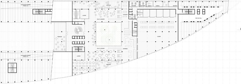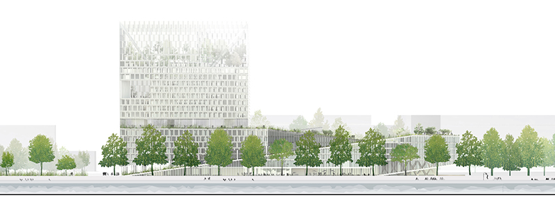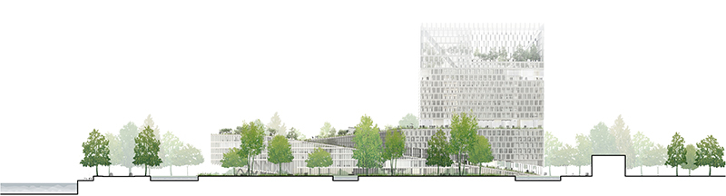 Il s’agit donc d’une verticalité ouverte, pour un bâtiment accessible conçu sur le principe d’une organisation qui induit un rapport avec l’environnement novateur. Le bâtiment s’extraie du sol progressivement, conscient de son ancrage, de ce qui est la base de son innervation. Il s’élève en pente douce comme une invitation à le parcourir par des chemins détournés. Les terrasses filent, les pleins et vides s’entremêlent. En s’élevant, la construction devient plus légère, plus transparente, de larges terrasses génèrent des porosités entre intérieur et extérieur. Au sommet sur les 20 derniers mètres, le minéral s’efface presque complètement au profit d’un vaste jardin suspendu déployé verticalement. Sans mimétisme il propose des connivences fortes avec la tour Horizons, marqueur de l’autre extrémité du Trapèze. Nous proposons un bâtiment composé de trois corps : un socle, un fut et un jardin suspendu, une gradation en trois temps de la minéralité vers la légèreté et l’abstraction.