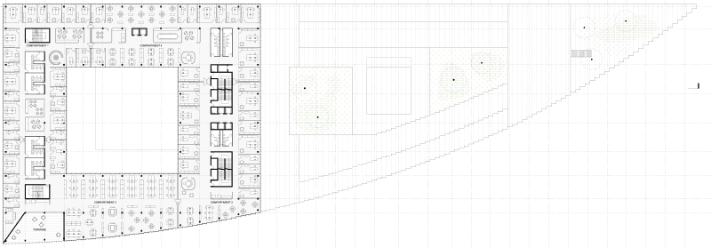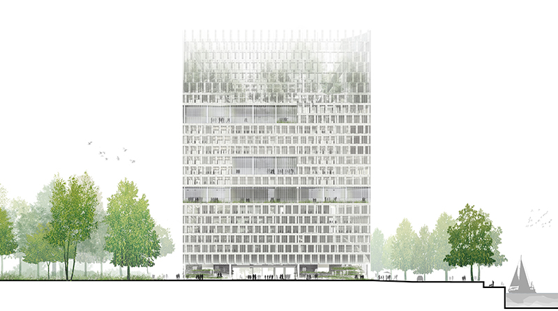 La demande spécifique de construire la hauteur comme un cumul de plans de références au titre de l’accessibilité des moyens de lutte contre l’incendie nous a conduits à nous interroger sur la manière dont les différentes composantes du projet peuvent se superposer afin de générer un déploiement du territoire. Réfutant toute idée de réaliser quelques éléments infra-structurels, toute voirie ou rampe, tout élément exogène à la nature même d’un bâtiment tertiaire, nous vous proposons un projet conçu comme le déploiement d’un territoire dans une logique paysagère. A l’instar d’une Babylone des temps modernes, il s’agit de construire sur le construit, d’habiter les toitures, de leur donner une valeur d’usage. Il s’agit d’un projet tectonique, d’origami où le territoire est plissé en plans successifs. Le socle, est envisagé comme un événement topographique, une strate inclinée, un jardin déployé en plans successifs. Extrusion parfaite de la parcelle, le socle délimite parfaitement l’ilot en s’inscrivant rigoureusement dans les alignements et gabarits des ilots qui bordent le quai. A l’extrémité, sur la pointe, le volume se soulève pour pincer une vue privilégiée sur le parc. Sur ce socle est posé un cube en lévitation, à la base tronquée par la topographie du socle. Les volumes sont articulés par des césures, par des strates paysagées – interfaces entre végétal et minéral. Ce cube est perforé au centre par un large patio traversant l’ensemble du projet sur 89 m de haut. Ce dispositif offre une lecture à contre-jour du volume et met en exergue la légèreté de la volumétrie. L’ensemble est surmonté par une serre, vaste jardin vertical qui vient achever, dans un effacement progressif, la verticalité. L’élancement qui caractérise les tours n’est ici pas de mise, la hauteur limitée à 89 m nous conduit à mettre en valeur d’autres qualités de la hauteur.