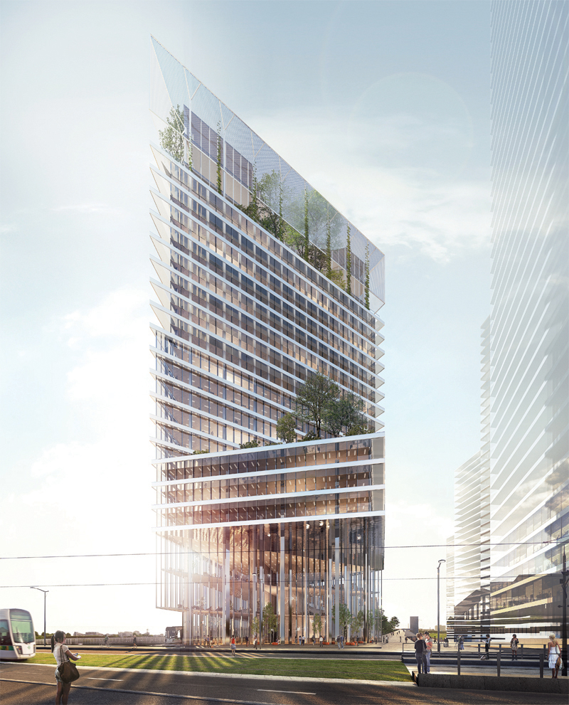 La tour affirme une présence discrète. Un marqueur à même de jouer le rôle de « starteur » pour à terme se fondre dans un quartier une fois celui-ci constitué. C’est à partir de cette complexité programmatique et formelle que nous proposons une architecture singulière et forte, à même de marquer le point de départ du nouveau quartier.